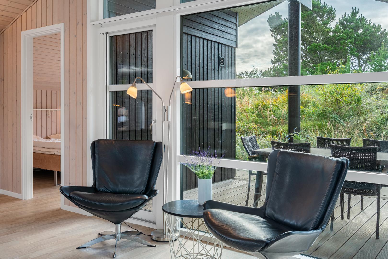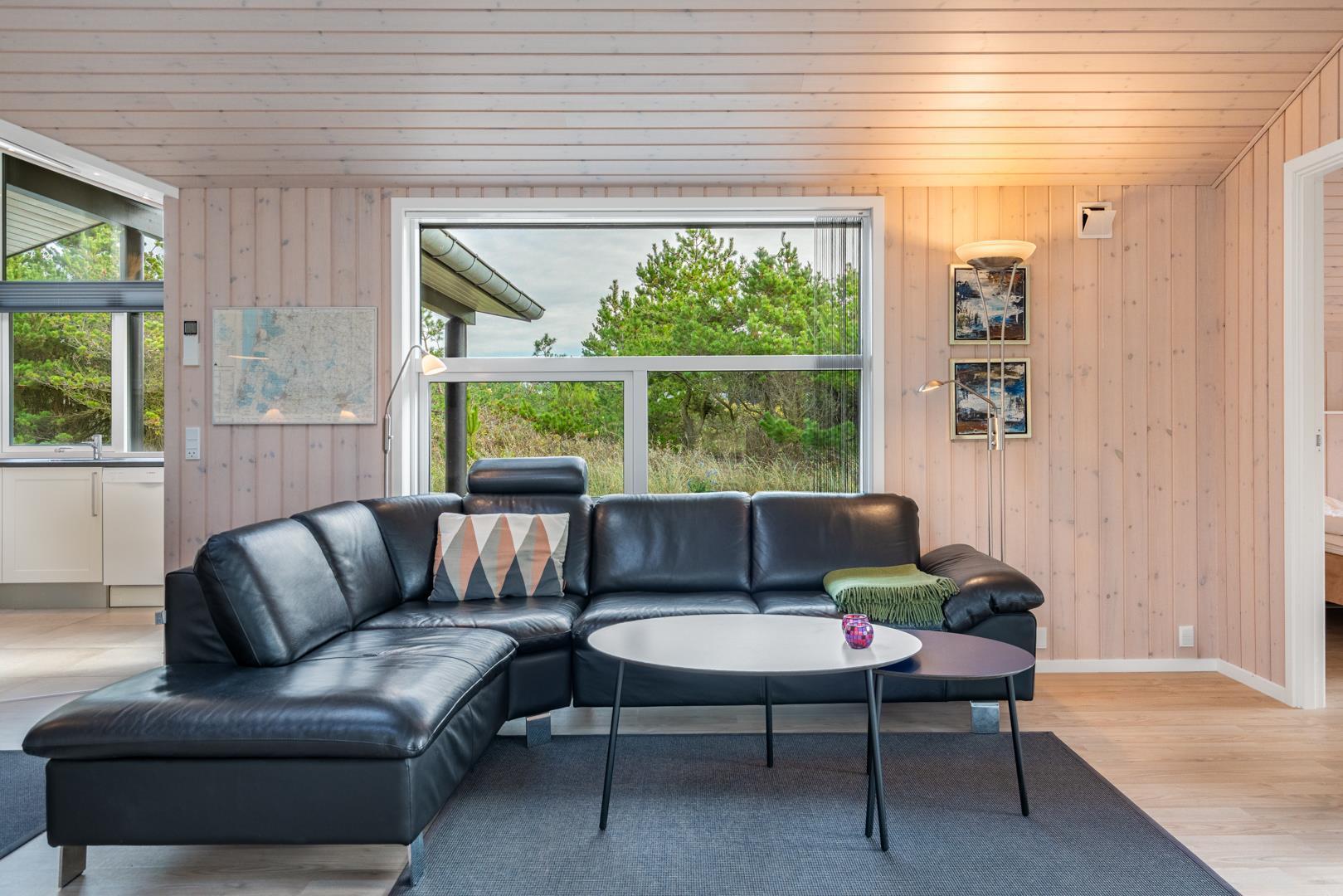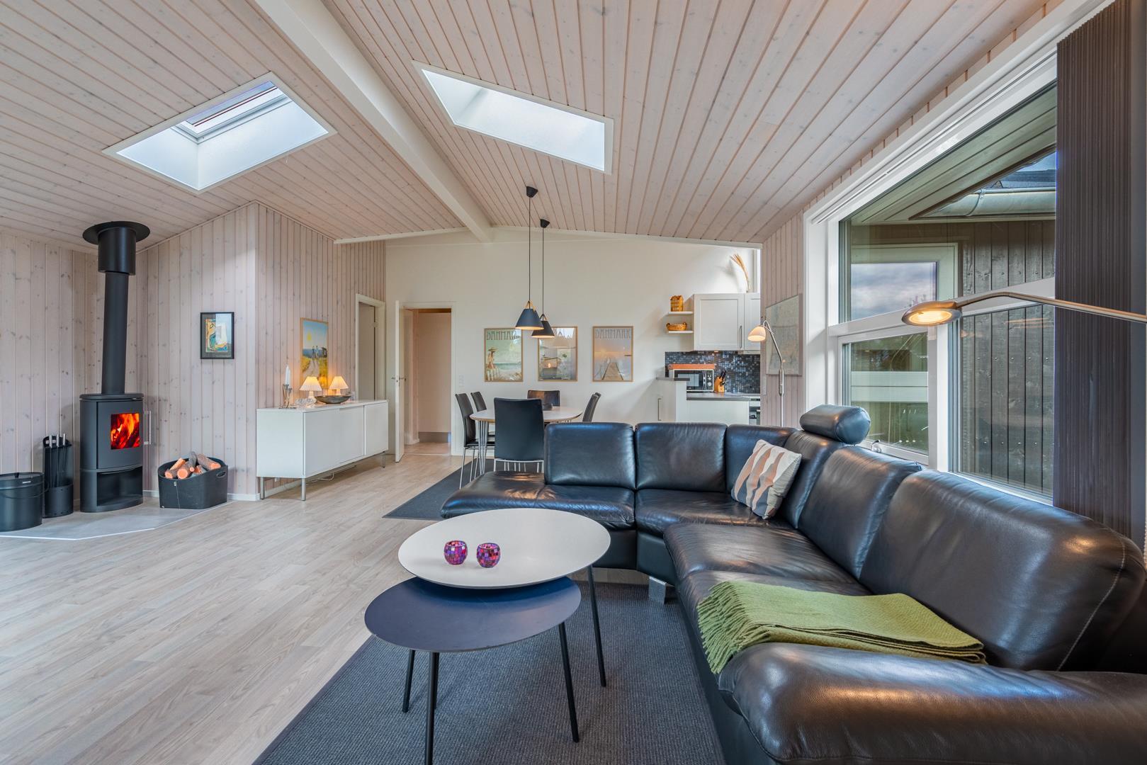 Der Mittelpunkt des Ferienhauses ist der großzügige Wohnbereich mit großen Fenstern, die viel Licht hereinlassen und eine warme Atmosphäre schaffen. Hier sorgt der Kamin für hyggelige Abende, egal ob du nach einem Strandtag entspannen oder es dir an kühlen Tagen besonders gemütlich machen möchtest. Die Wärmepumpe unterstützt eine angenehme Temperatur und hilft gleichzeitig, den Energieverbrauch niedrig zu halten.