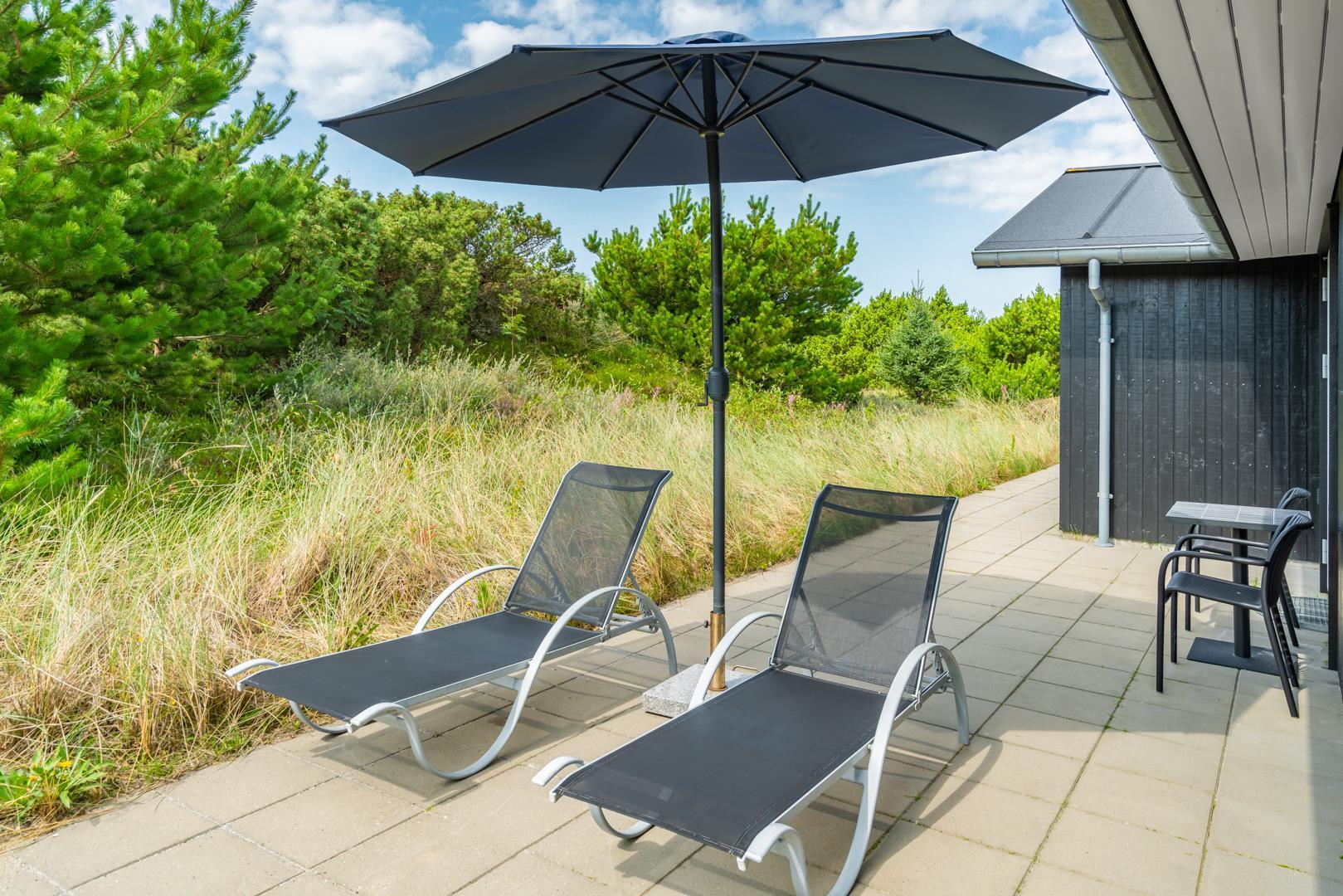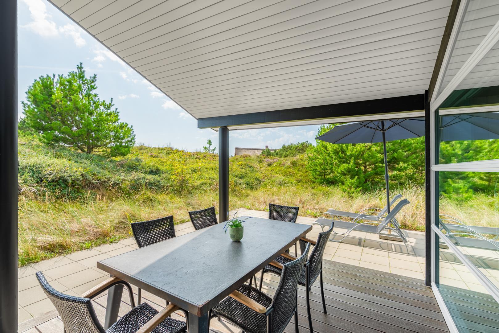Der Außenbereich des Ferienhauses ist ideal für alle, die Ruhe und frische Nordseeluft genießen möchten. Die teilweise überdachte Terrasse eignet sich hervorragend für gemütliche Mahlzeiten, Grillabende oder entspannte Stunden im Freien.