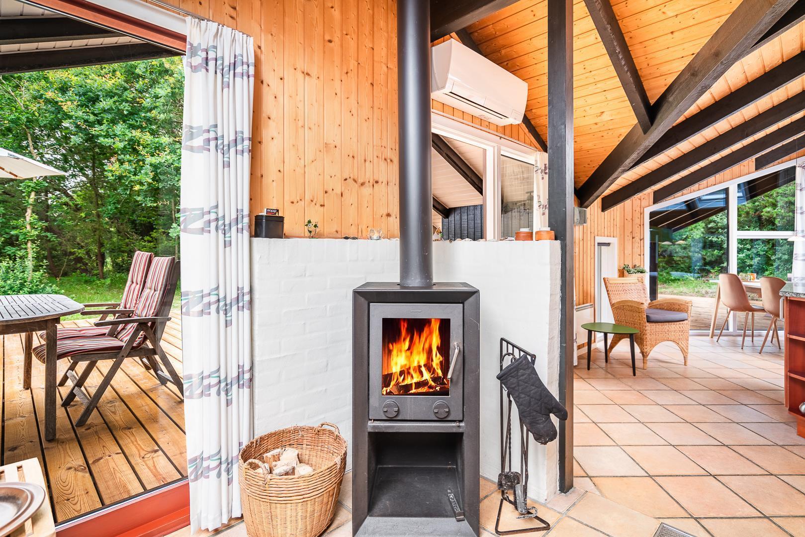 Die große Wohnküche mit Fußbodenheizung ist offen mit dem behaglichen Wohnzimmer verbunden, wo ein Kaminofen mit Glastür für echte Ferienhaus-Gemütlichkeit sorgt. Vom Wohnzimmer aus gelangt man direkt auf eine große, teilweise überdachte und windgeschützte Terrasse, auf der man den ganzen Tag über Sonne und Natur in vollen Zügen genießen kann.