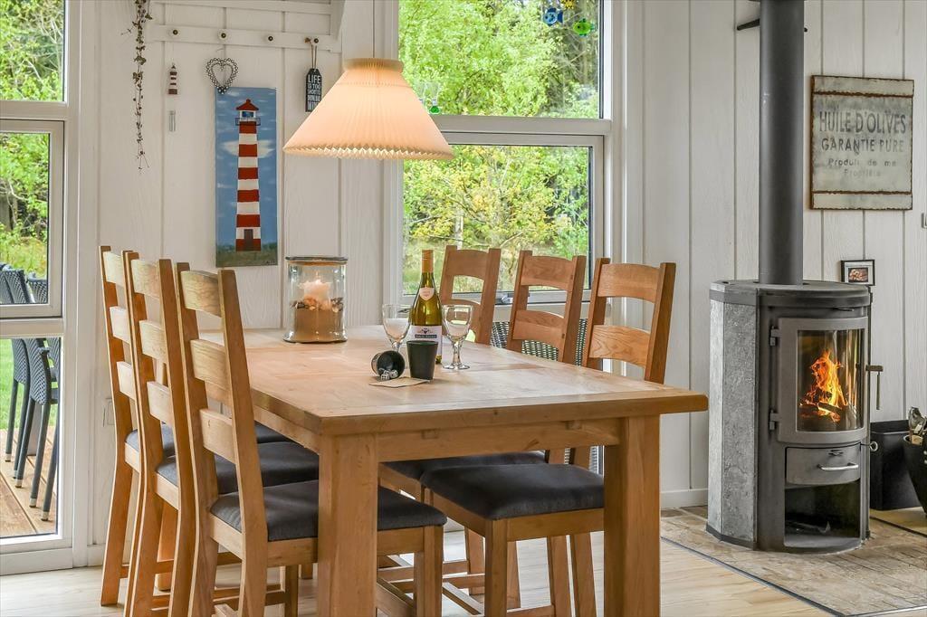 Draußen erwartet dich eine sonnige Terrasse, die den perfekten Rahmen für entspannte Urlaubstage an der frischen Luft bietet. Finde deinen Lieblingsplatz in der Sonne, lehn dich in den Liegestuhl zurück und genieße die Ruhe, die Henneby so besonders macht. Der gemütliche Pavillon verlängert die Outdoorsaison und lädt dazu ein, die Mahlzeiten auch bei kühleren Abenden im Freien zu genießen – geschützt vor Tau oder Wind, der durch die Baumwipfel rauscht. Vielleicht zündet ihr Kerzen an und lasst den Tag bei einem Glas Wein im Pavillon ausklingen, während die Sonne langsam hinter den Bäumen versinkt? Alles rund ums Haus lädt zu Ruhe, Nähe und langen, entspannten Ferientagen ein – Tage, an denen du nichts weiter tun musst, als den Moment zu genießen.