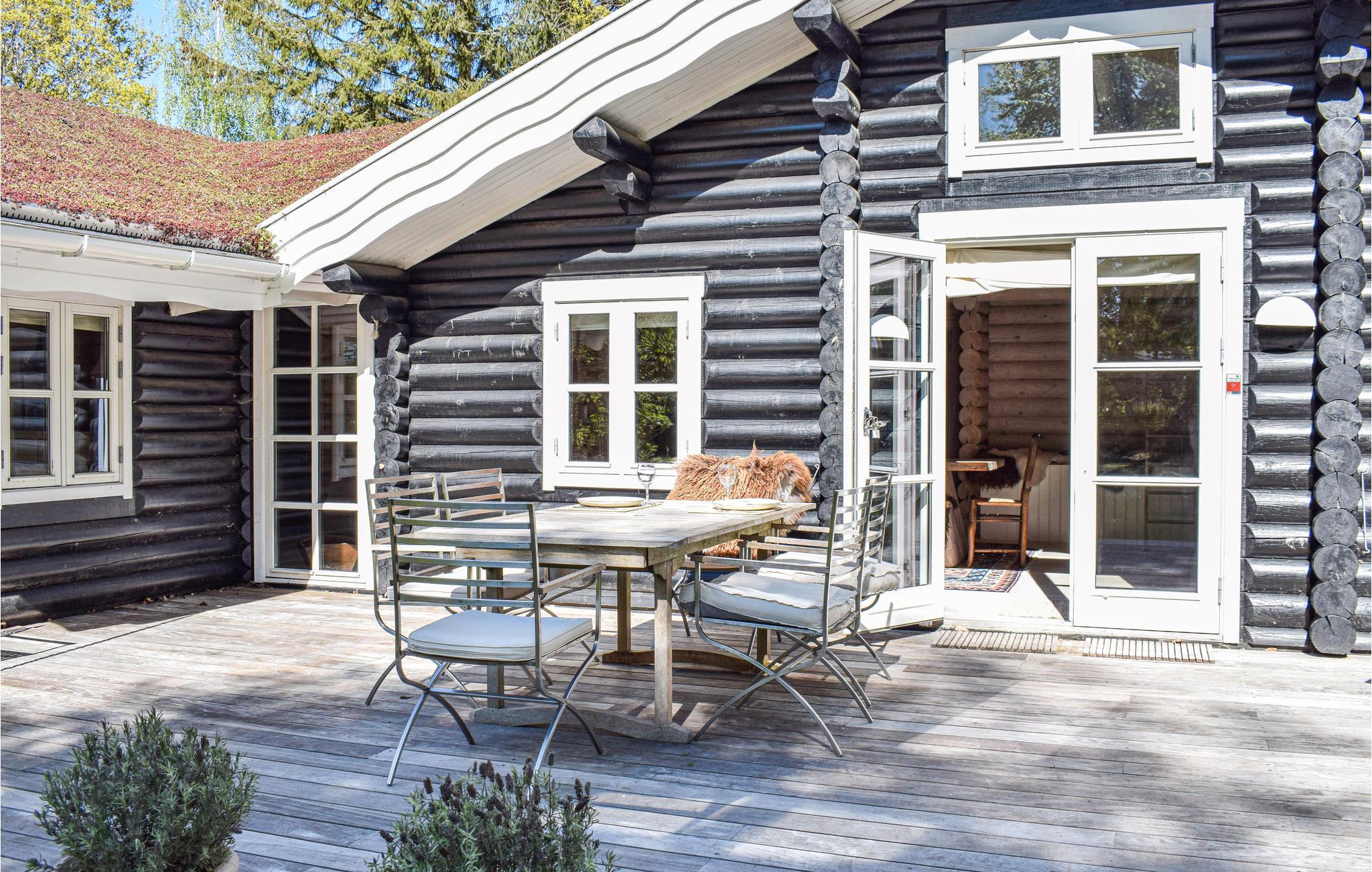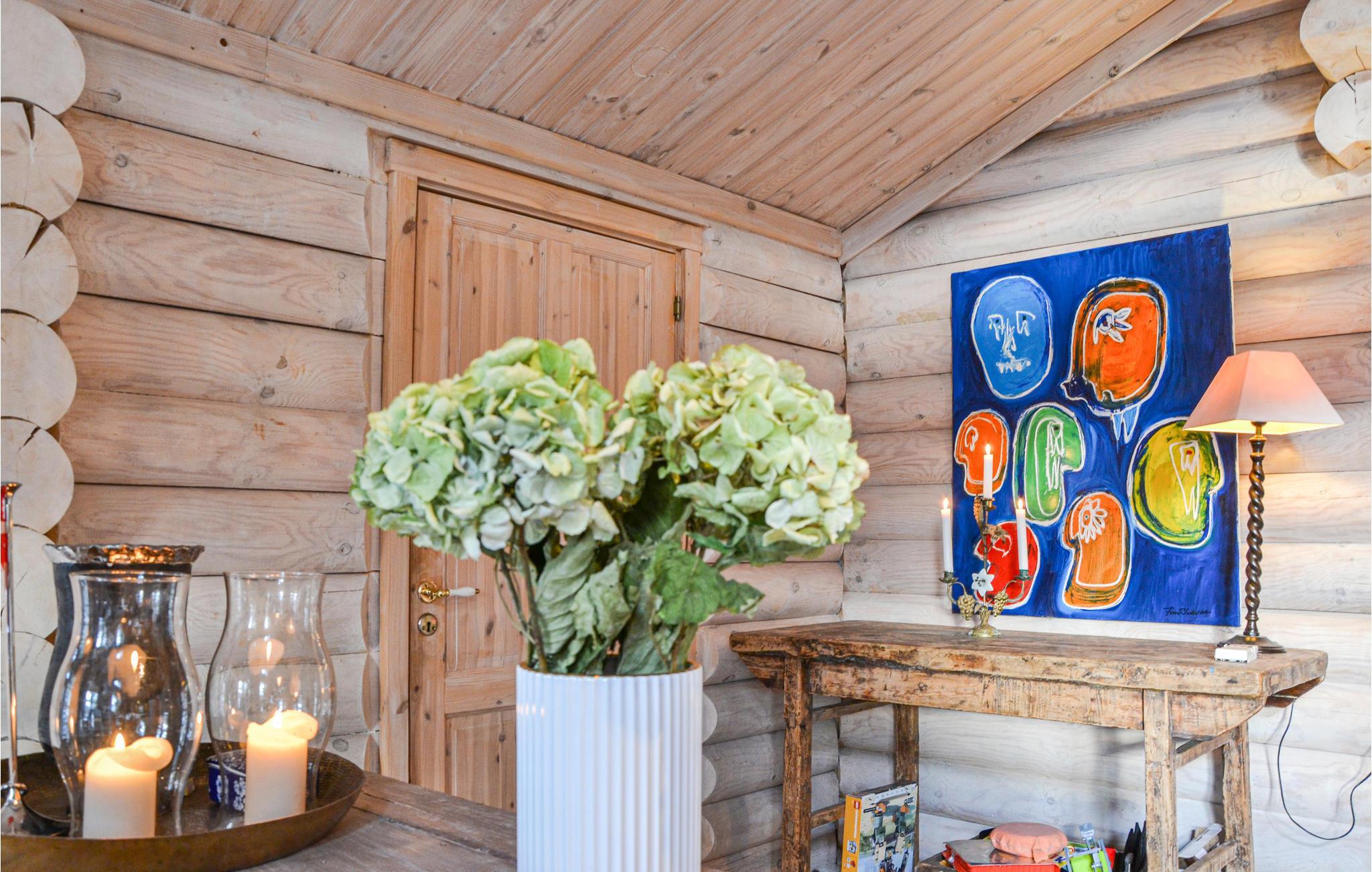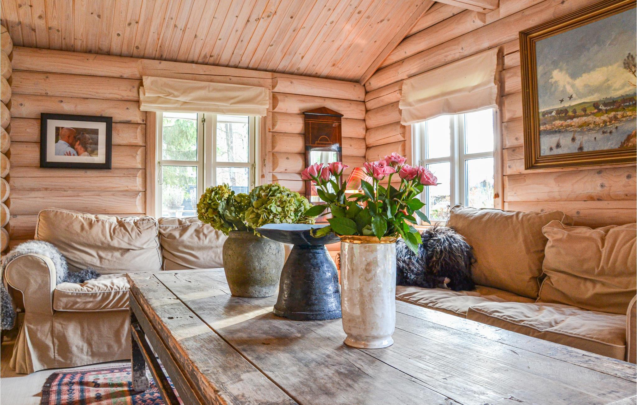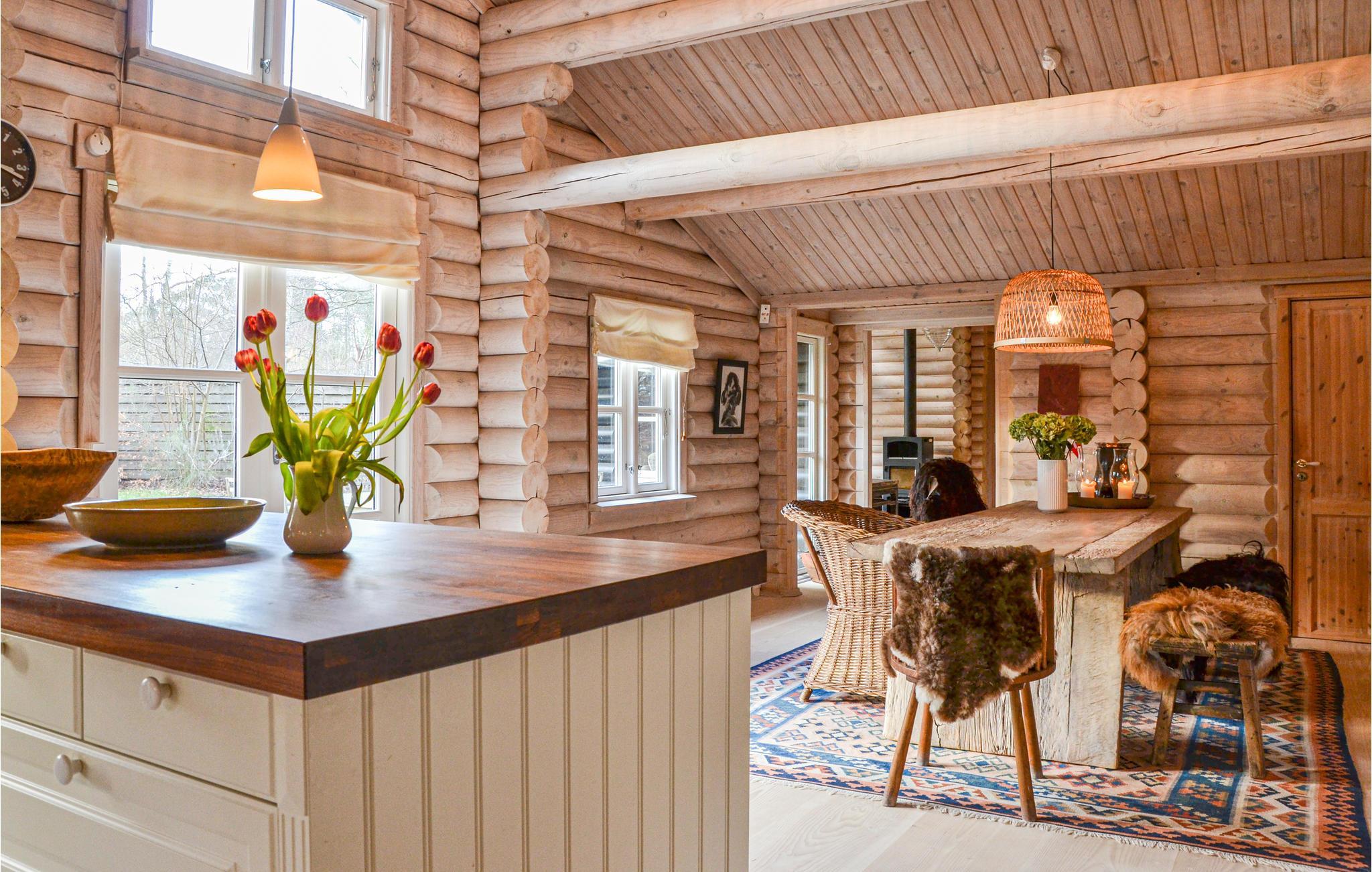 Das Ferienhaus im Blockhausstil ist geschmackvoll mit Liebe zum Detail eingerichtet. Es verfügt über einen Holzofen im Wohnbereich, der eine angenehme Wärme verbreitet. In allen Räumen gibt es einen offenen Dachfirst und die schönen Balken sorgen für eine gemütliche Atmosphäre. Das Wohnzimmer ist eine Erweiterung der gut ausgestatteten Küche mit einem schönen Essbereich. Im Haus gibt es 4 gute Schlafzimmer.