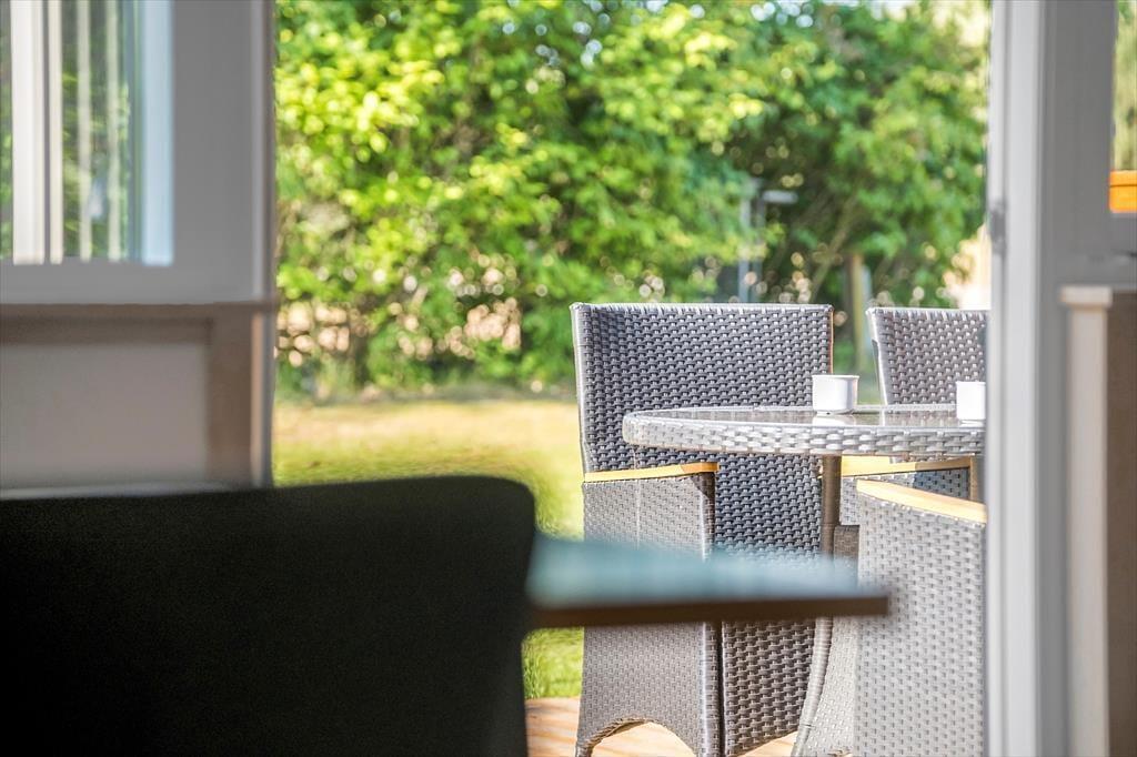 An die Südseite des Urlaubsdomizils schmiegt sich eine schöne Holzterrasse, die zum Weg hin durch eine Windschutzwand abgeschirmt ist. Auf dieser Terrasse können Sie sich in spannende Bücher vertiefen, sich auf dem Liegestuhl sonnen und gemütliche Grillabende im Kreise Ihrer Lieben verleben. Die Grasfläche des 1.300 m² großen Grundstücks animiert zum Umhertollen und Ballspielen. Ihren Pkw stellen Sie in der mit Schotter versehenen Grundstückseinfahrt ab.