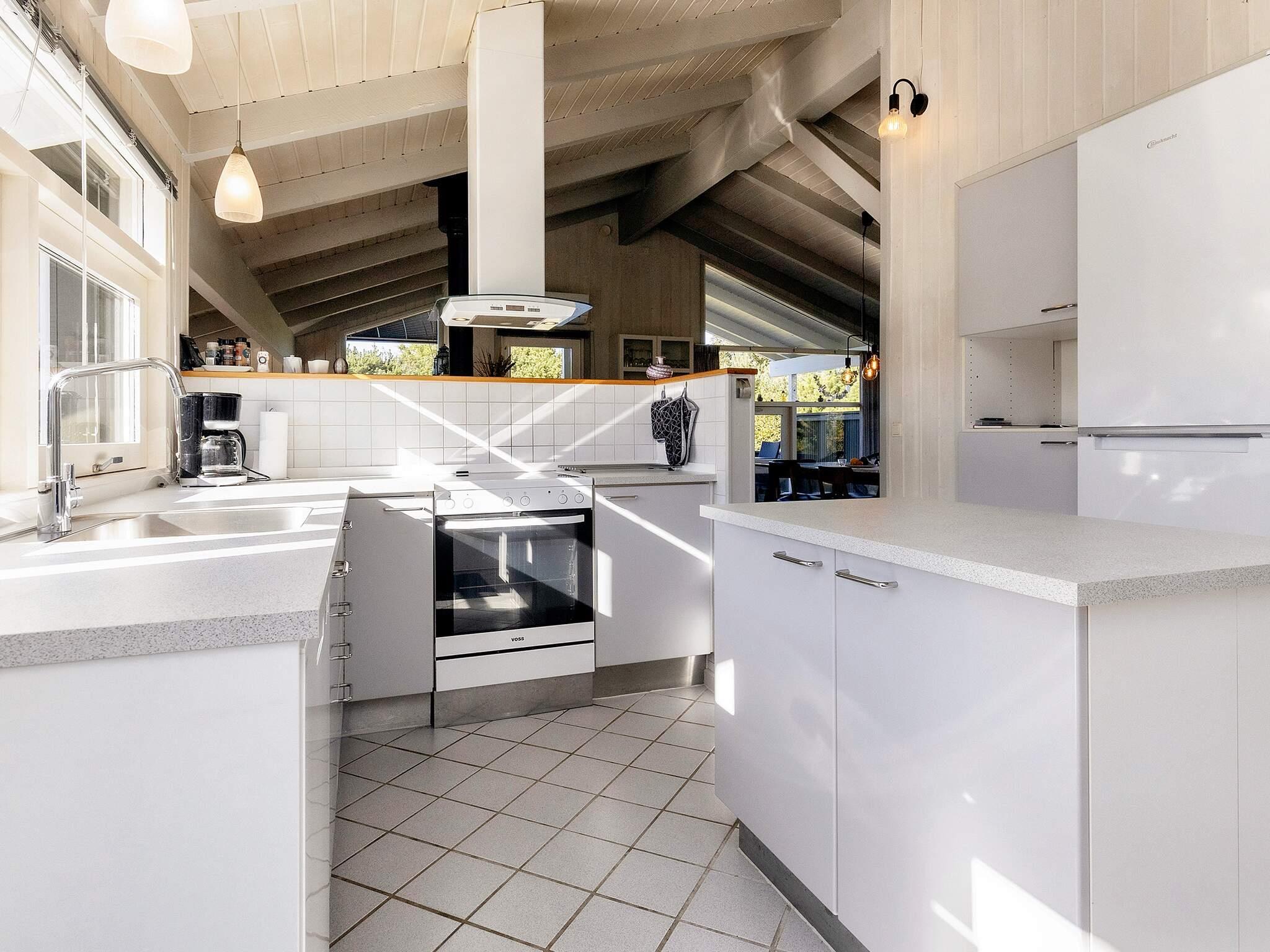 Das Ferienhaus hat eine Eingangsdiele mit Garderobe, eine offene Küche, zwei Schlafzimmer mit Doppelbett und ein drittes Schlafzimmer mit einem Etagenbett. Darüber hinaus gibt es ein großes, helles Badezimmer mit Dusche, Whirlpool und Sauna sowie ein zweites Bad mit Dusche im Haus. Offene Zimmerdecke bis zum First für ein luftiges Ambiente. Sowohl klimafreundliche Wärmepumpe als auch gemütlicher Holzofen zum Heizen im Haus.