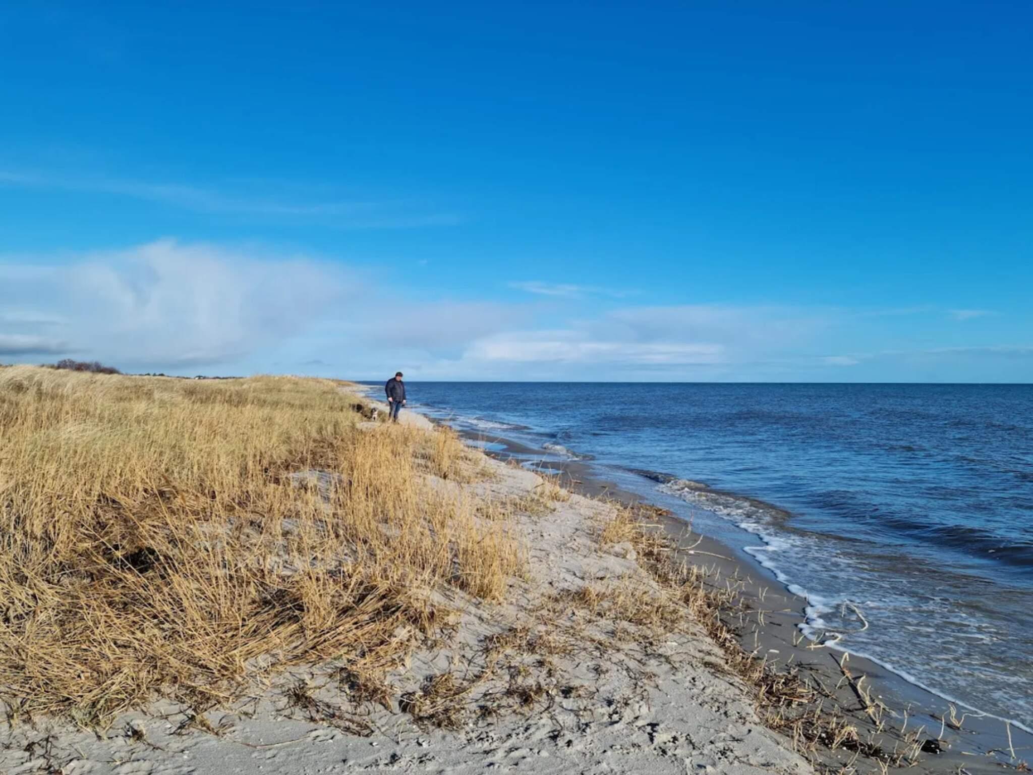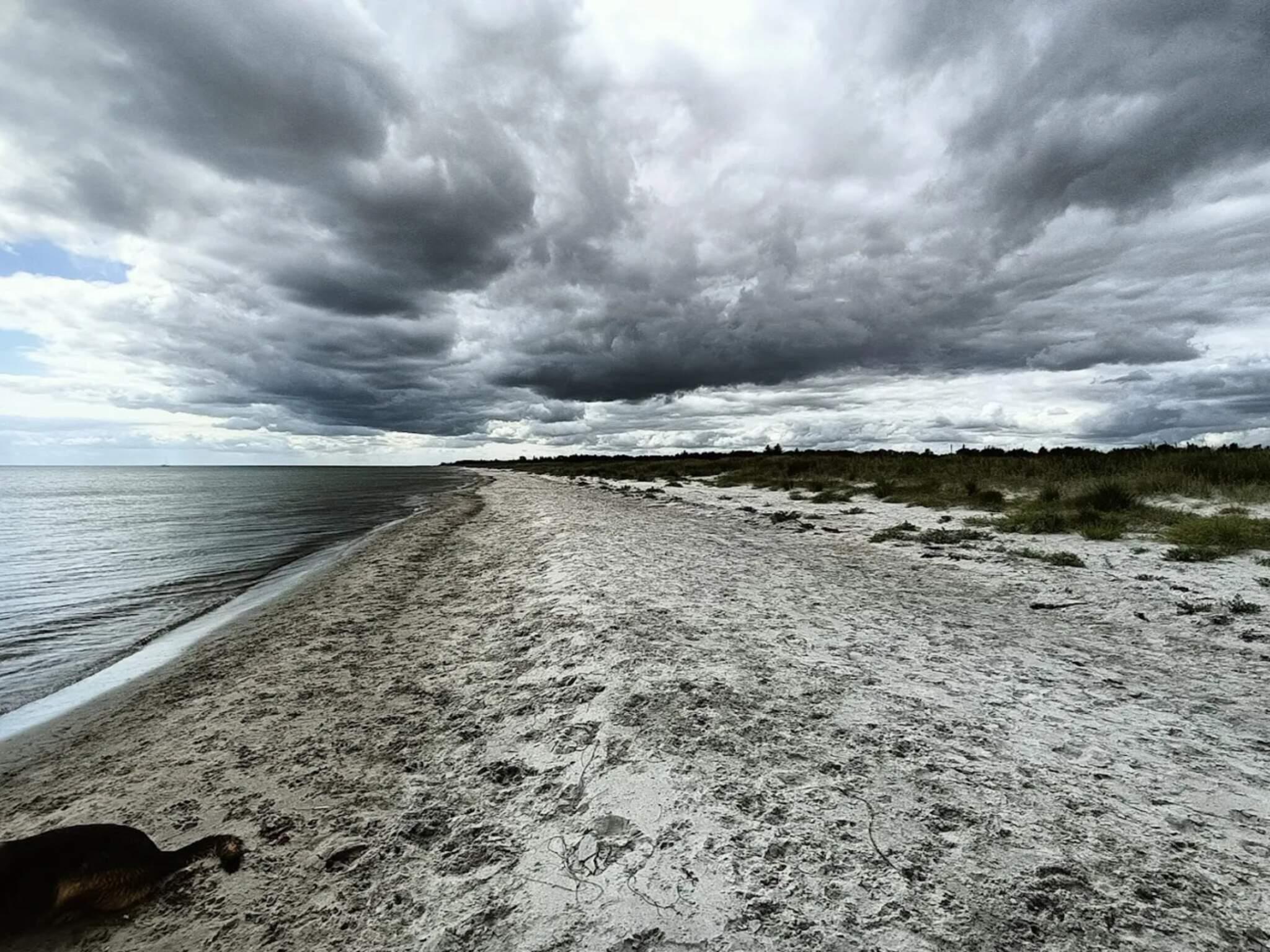 Der Eingangsbereich bietet praktischen Stauraum und beherbergt eine Waschmaschine und einen Trockner. Hier befindet sich ein helles Badezimmer mit Whirlpool, neben einem Schlafzimmer mit Doppelbett und Kleiderschrank. Die offene Küche geht nahtlos in das Wohnzimmer über, das mit einem gemütlichen Holzofen und einer klimafreundlichen Wärmepumpe für kühlere Tage ausgestattet ist. Für Unterhaltung sorgt ein Fernseher mit Chromecast und integriertem Kabelanschluss, der skandinavische und einige deutsche Sender bietet. Vom Wohnzimmer aus gelangen Sie auf eine große, überdachte Terrasse mit herrlichem Blick auf das Wasser.