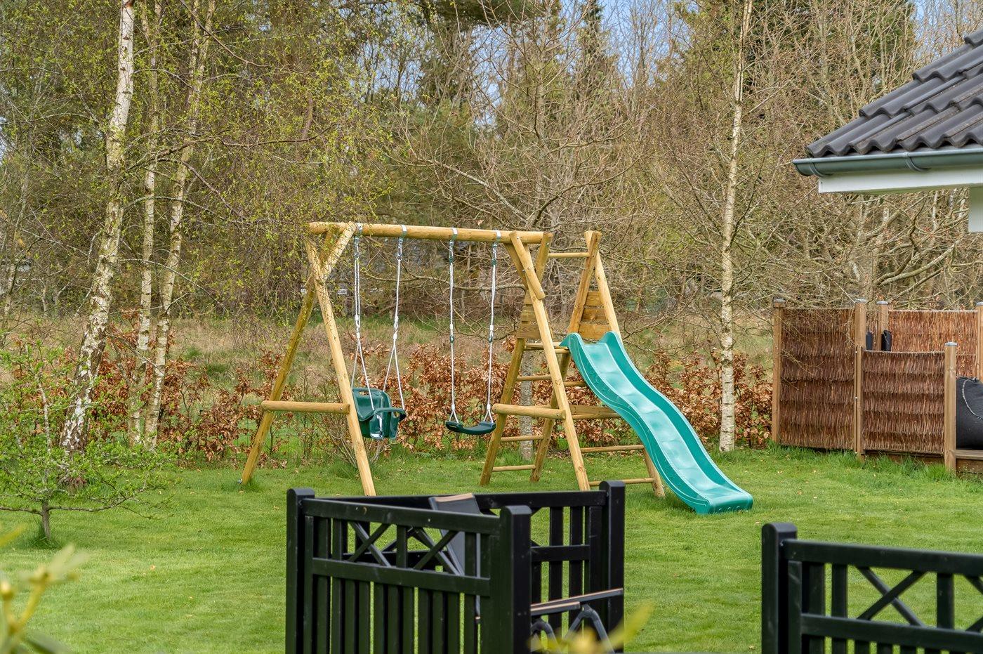 Draußen gibt es zwei Terrassen, sodass du die Natur aus verschiedenen Blickwinkeln genießen kannst. Die größere Terrasse ist mit einem Grill und einer überdachten Fläche von 13 m² ausgestattet – ideal für gemütliche Mahlzeiten im Freien. Nur wenige Meter vom Haus entfernt liegt eine weitere Terrasse mit einem Wildnisbad und einer schönen Nische, perfekt zum Lesen und Sonnenbaden. Der große, sonnige Rasen lädt Kinder und Erwachsene zu Spiel und Aktivitäten ein.