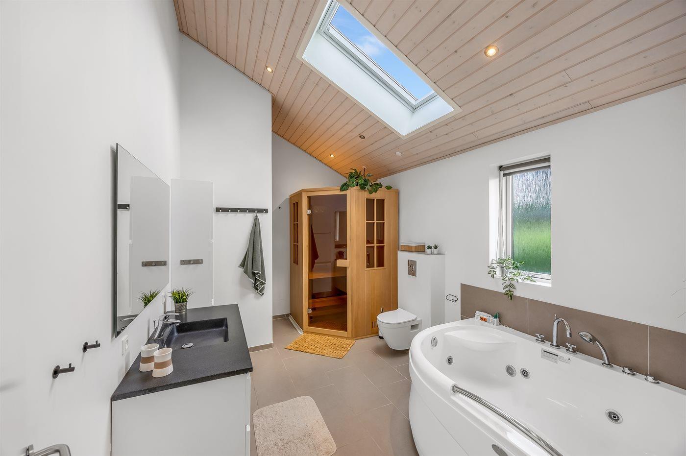 Es gibt 2 Badezimmer mit Duschnische und 2 Toiletten. Fußbodenheizung in 2 Badezimmern. Es steht eine Sauna zur Verfügung in der Sie sich so richtig entspannen können.