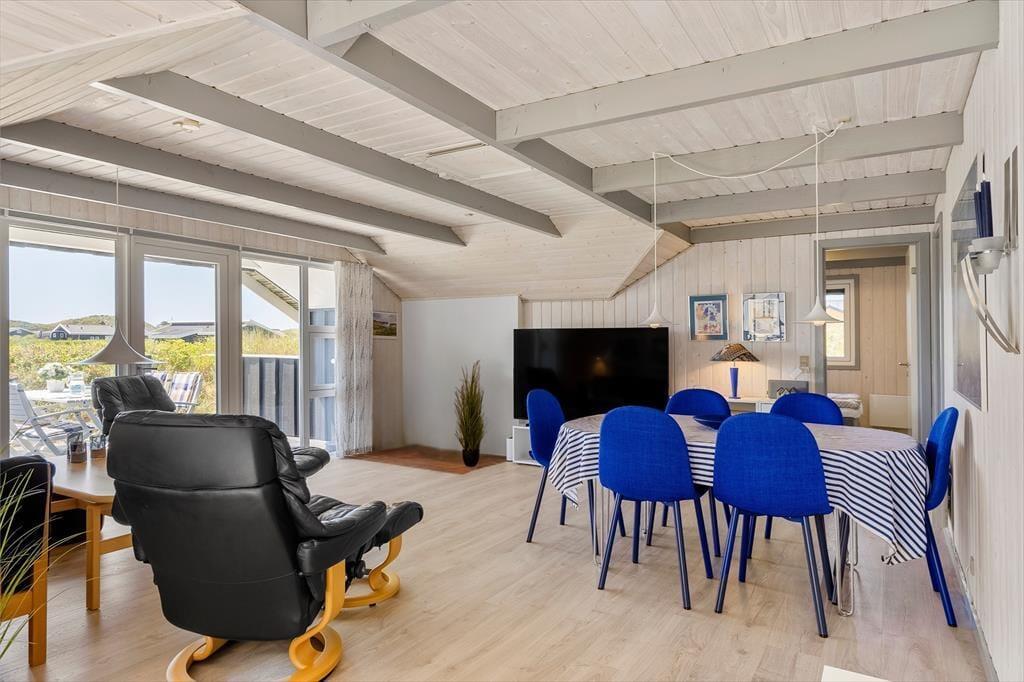 Im Inneren des Hauses erwartet Sie eine warme, entspannte Atmosphäre. Die offene Raumgestaltung verbindet Küche, Essbereich und Wohnzimmer zu einem lichtdurchfluteten Lebensmittelpunkt. Hier können Sie gemeinsam kochen, essen, spielen oder sich einfach zurücklehnen und die Ruhe genießen. Große Fenster lassen viel Licht herein und eröffnen einen wunderschönen Blick in die umliegende Natur – so fühlt man sich auch drinnen ganz nah am Draußen. Drei gemütliche Schlafzimmer bieten ausreichend Platz für die ganze Familie. Im praktischen Eingangsbereich ist Platz für Jacken und Schuhe – und in den kühleren Monaten lässt sich dieser Raum auch wunderbar als kleine Veranda mit Ausblick auf die Dünen nutzen.