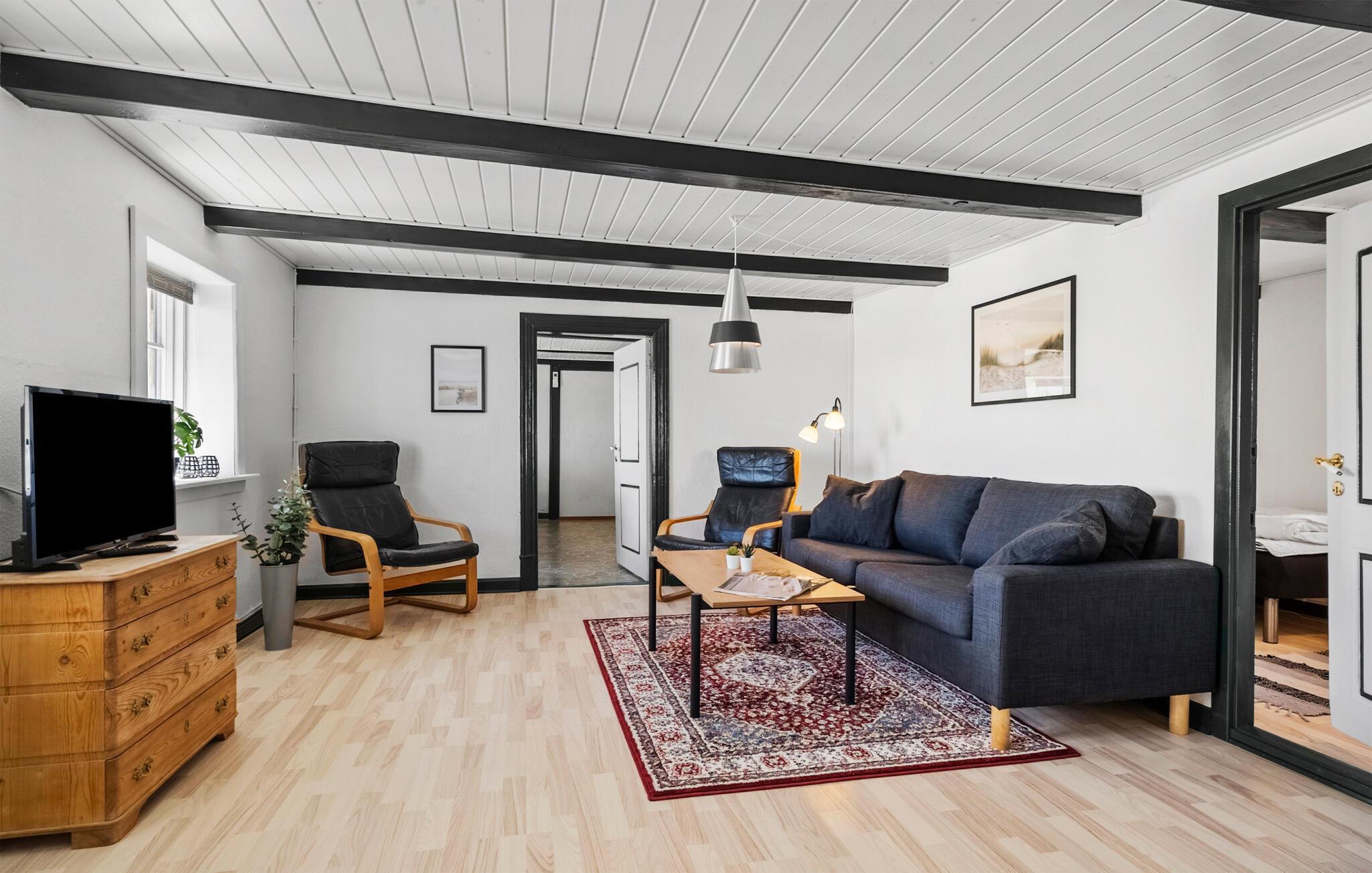 In der ersten Dünenreihe von Houvig gelegen bietet diese Wohnung die ideale Basis für einen naturnahen Urlaub. Der direkte Zugang zum Strand ermöglicht entspannte Spaziergänge und erholsame Stunden in der frischen Seeluft. Von der Terrasse aus genießen Sie einen beeindruckenden Blick auf das Meer und den Vest Stadil Fjord. Im Inneren der Wohnung erwartet Sie ausreichend Platz für die ganze Familie. Der helle Wohnbereich mit seinen gemütlichen Sitzmöbeln lädt zu entspannten Abenden ein und bezaubert mit schönen Details wie den sichtbaren Deckenbalken und authentischen Möbeln. Kochen Sie gemeinsam in der gut ausgestatteten Küche. Für gesellige Mahlzeiten steht Ihnen ein großer Esstisch in der separaten Essecke zur Verfügung.