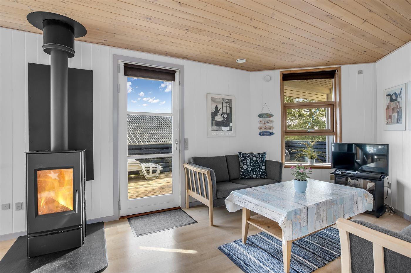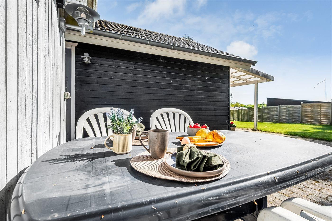 Das Ferienhaus verfügt über eine schöne Terrasse, die teilweise überdacht ist. Von hier aus kann man die Stille in vollen Zügen genießen, und es gibt immer die Möglichkeit, eine windgeschützte Ecke zu finden, auch wenn es oft etwas windig sein kann, da das Haus erhöht liegt, aber dafür mit einer schönen Aussicht auf die Umgebung. Die Ferienregion lädt zu Spaziergängen in der herrlichen Natur ein, und ein besonderes Erlebnis ist ein Besuch des Hvidbjerg Dünen, das nur etwa 250 Meter vom Ferienhaus entfernt liegt. In der Umgebung gibt es auch ein Eiscafé und ein Café.