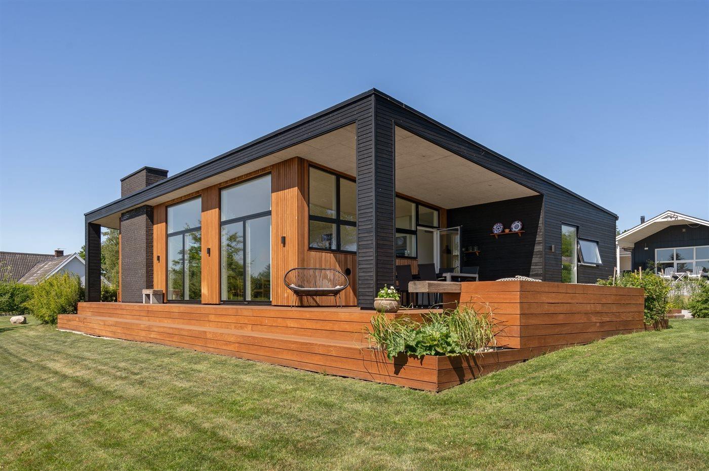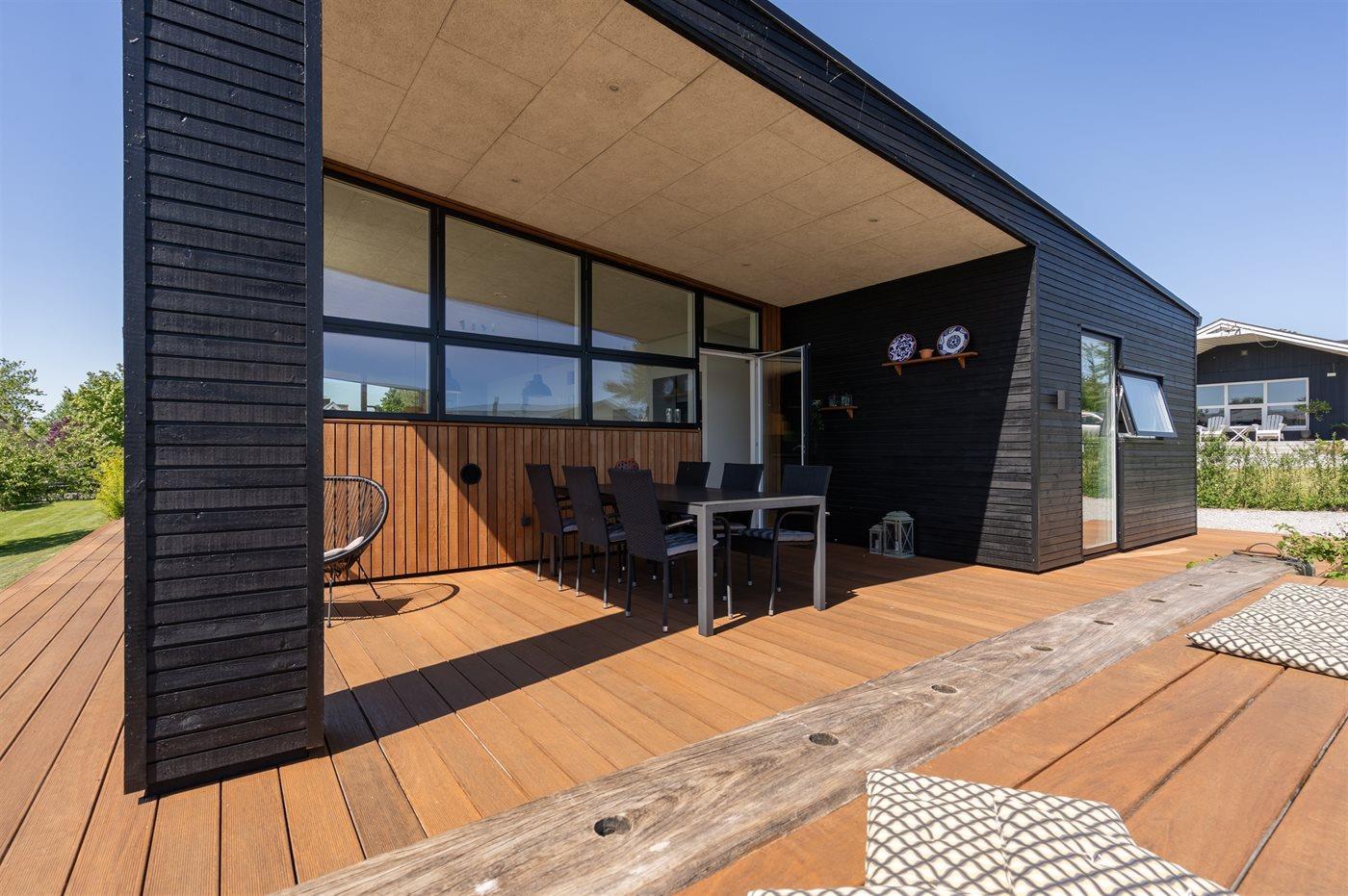 Modernes Ferienhaus mit Meerblick, Whirlpool und großer Terrasse nahe kinderfreundlichem Strand in Høll, Dänemark.