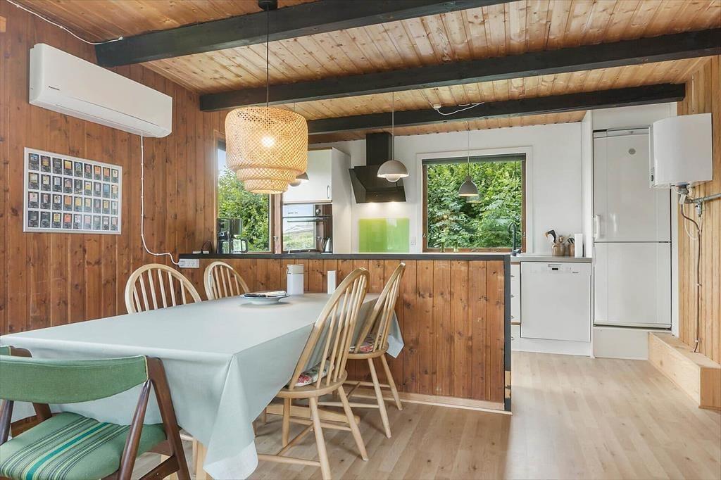 Wenn du das Ferienhaus betrittst, empfängt dich eine warme Atmosphäre, die sofort das Gefühl vermittelt, zu Hause zu sein. Die Einrichtung ist schlicht und gemütlich, und im Wohnzimmer versammelt der Kaminofen die Familie an kühleren Abenden, während ihr dem Knistern des Feuers lauscht, Spiele spielt, einen guten Film schaut oder einfach gemeinsam die Ruhe genießt. Küche und Wohnbereich gehen harmonisch ineinander über und schaffen den perfekten Rahmen für die Mahlzeiten im Urlaub. Die Fenster lassen viel Licht herein und bieten einen schönen Blick in den Garten, sodass die Natur immer präsent ist. Alles ist so gestaltet, dass ihr euch schnell einlebt und sofort in Urlaubsstimmung kommt.