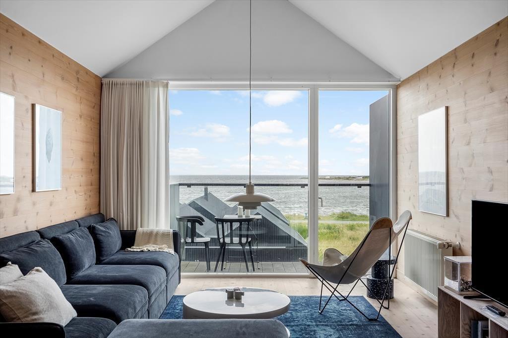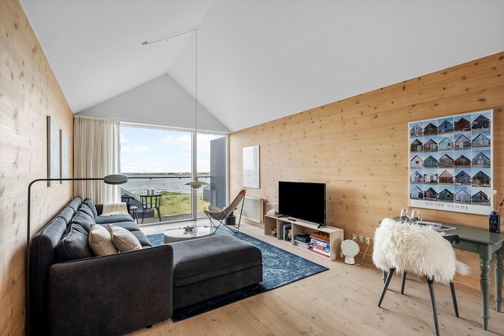Der moderne Wohnkomplex "Slusen" setzt sich aus attraktiven Reihenhäusern zusammen, die direkt am Fjordufer liegen. Dieses Exemplar befindet sich in der zweiten Häuserreihe. Der Wohnraum im Obergeschoss verwöhnt mit einem imposanten Panoramablick über das Wasser und über die Schleuse Hvide Sandes. Der Wohnraum verspricht mit seinem Kaminofen, dem großen Flachbild-TV und den weichen Polstermöbeln - inklusive eines Schlafsofas - entspannte und gemütliche Abende. Die beiden Schlafzimmer beinhalten jeweils ein komfortables Doppelbett. Zusammen mit dem Schlafsofa bietet Ihnen das Reihenhaus demnach fünf Schlafplätze. Ein Schlafraum ist im Erdgeschoss platziert, der andere im ersten Stock. Das Erdgeschoss umfasst darüber hinaus die schöne Küche samt Essplatz und zwei Badezimmer. Eines der Badezimmer begrüßt Sie mit einem tollen Eckwhirlpool, im zweiten sorgt eine Sauna für Wellnessflair. Zu den praktischen Annehmlichkeiten gehört das Nebengebäude, in dem eine Waschmaschine ein Wäschetrockner, eine Gefriermöglichkeit und ein Fischreinigungsplatz für Sie bereit stehen.