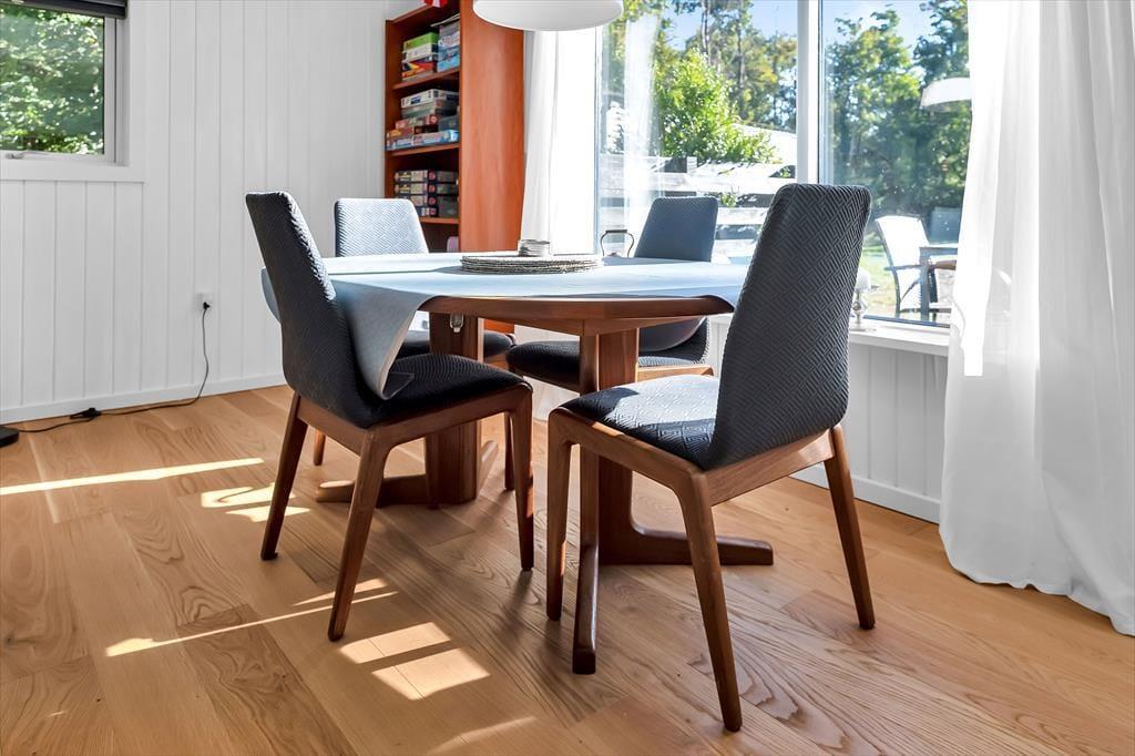 Dieses schöne Ferienhaus präsentiert sich hell und einladend und überzeugt mit einer gelungenen Raumaufteilung. Das Wohnzimmer bildet den Mittelpunkt des Hauses, in dem alle gemütlich am Esstisch zusammenkommen und den Blick in das weitläufige Grundstück genießen können. Kühle Sommerabende verbringst du entspannt vor dem Fernseher oder mit einem guten Buch auf dem Sofa, während das Knistern des Kaminofens für Ferienhausstimmung sorgt. Vom Wohnzimmer aus gelangst du direkt auf die große Holzterrasse.
