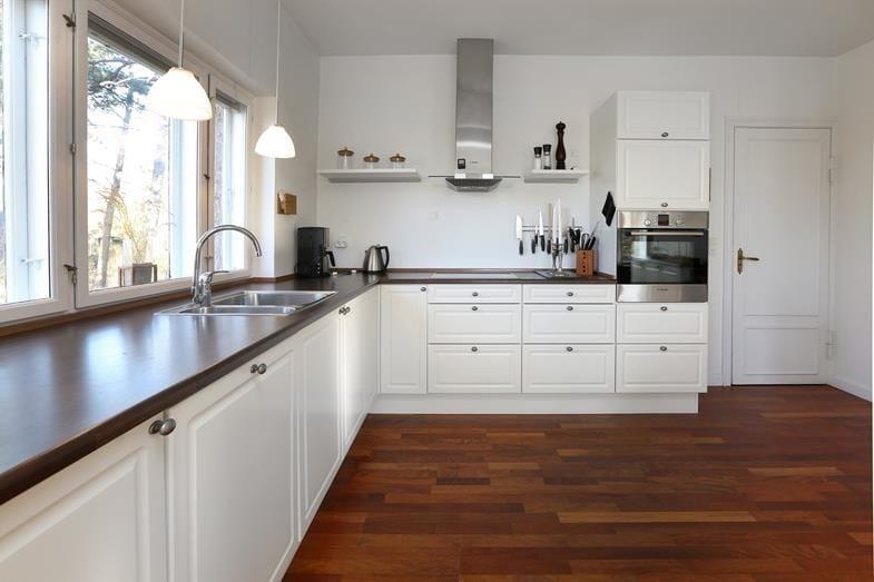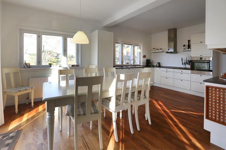 Sie betreten das schöne Haus, das hell und in einem hervorragenden Zustand ist. Sowohl vom Wohnzimmer als auch vom Essbereich und der Küche aus genießen Sie einen fantastischen, ungestörten Blick auf den Fjord. Ein Schlafzimmer verfügt über ein eigenes Badezimmer, ein weiteres großes Badezimmer ist mit hochwertigen Materialien ausgestattet. Das zweite Schlafzimmer hat einen Eingang vom Wohnzimmer aus.