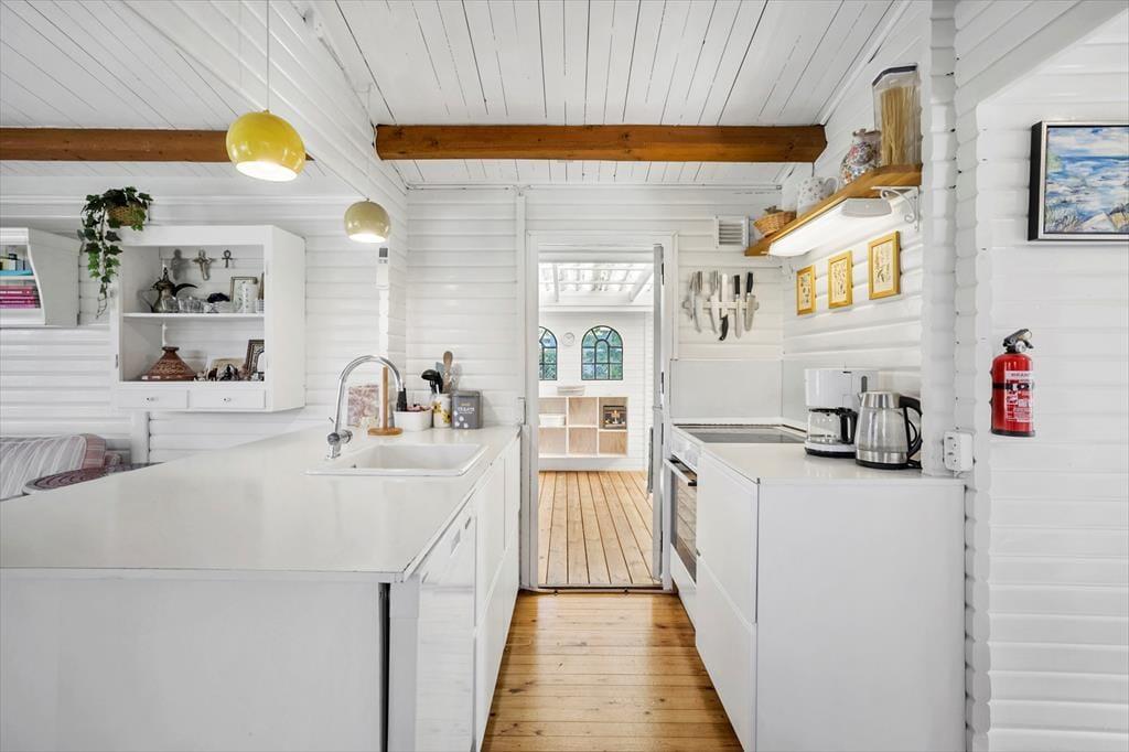 -in diesem schönen Ferienhaus. Das Haus hat eine Küche-Esszimmer alles in einem mit einem Holzofen, um eine gemütliche Wärme und Atmosphäre an einem kühlen Tag zu bieten. Das Haus hat 2 Schlafzimmer und einen Schlafbereich für den Wintergarten. In dem gut ausgestatteten Raum sind Sie nah beieinander, sowohl bei den Mahlzeiten als auch wenn Sie es sich in den weichen Möbeln gemütlich machen und Karten spielen wollen. Beachten Sie, dass sich der Fernseher im Schlafzimmer befindet.