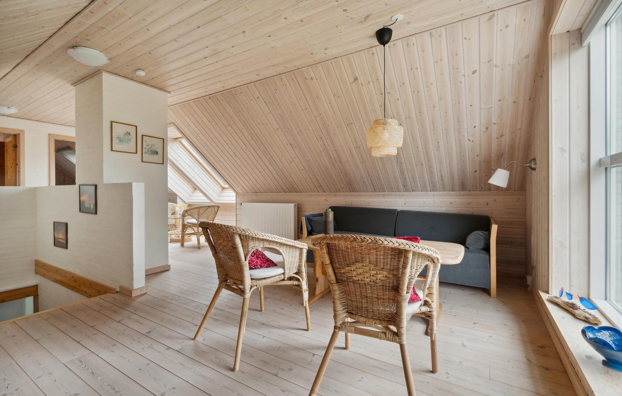 Mitten im Nationalpark Thy erwartet Sie dieses überaus komfortable Ferienhaus, es ist genau der richtige Ort für eine erholsame Auszeit mit der Familie. Die hellen Räume laden mit Ihrer wohnlichen Einrichtung zum Entspannen ein. Nehmen Sie den Nachmittagskaffee im ersten Stock vor den großen Dachfenstern ein, entspannen Sie nach einem Spaziergang in der Duft- und Dampfsauna, genießen Sie die gemeinsame Zeit und freuen Sie sich auf gemütliche Abende auf dem Sofa beim leisen Prasseln der Flammen im Kaminofen.