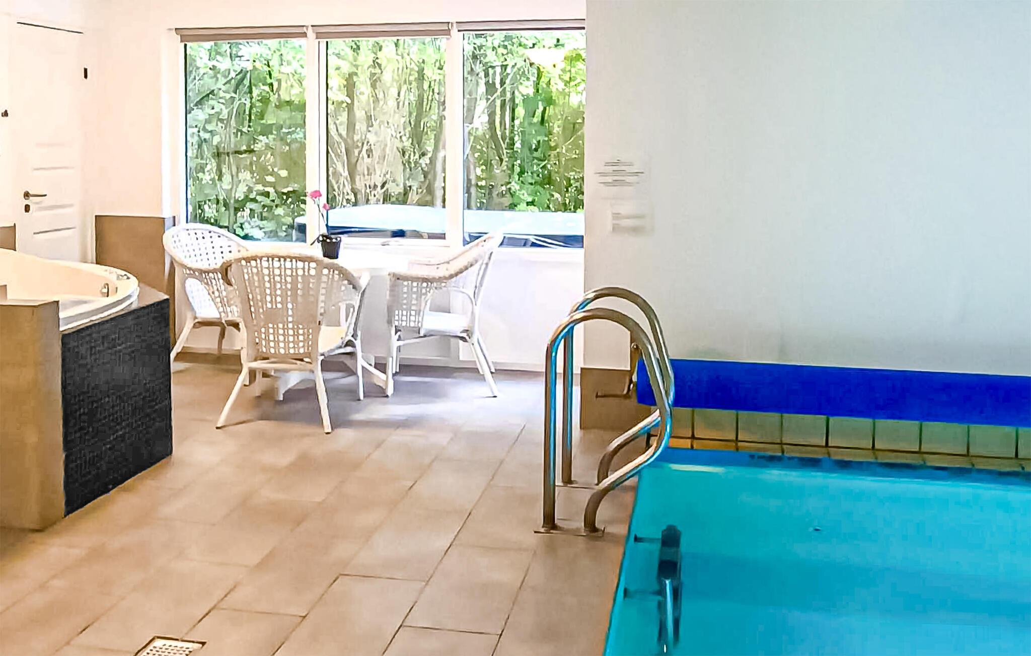 Gemütliches Ferienhaus mit Poolbereich, der mit Pool, Massagewanne und einem Badezimmer Sauna ausgestattet ist.