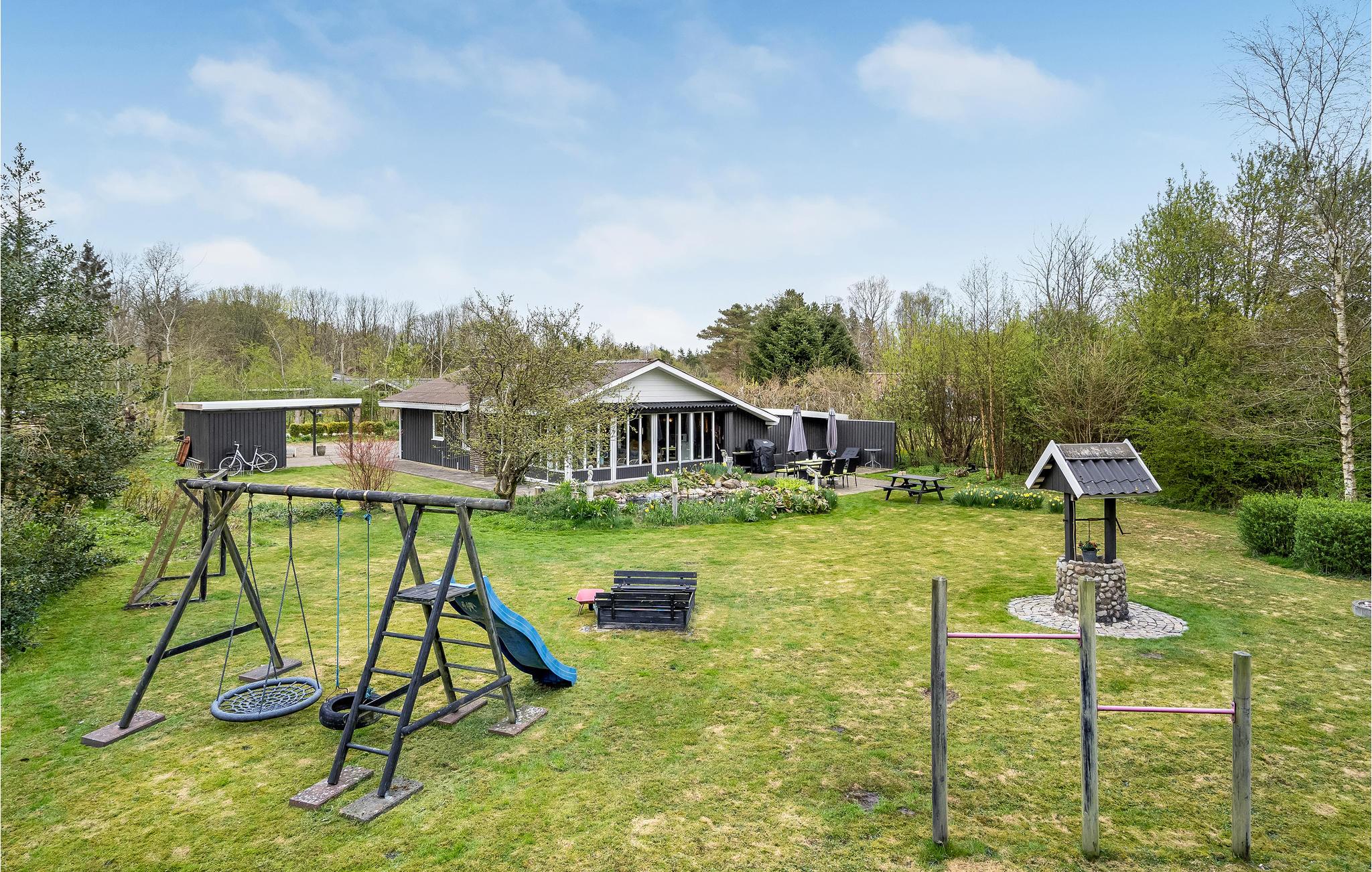 Typisch skandinavisches Ferienhaus mit großem Garten, Kaminofen und Spielgeräten in Oksbøl, Dänemark.