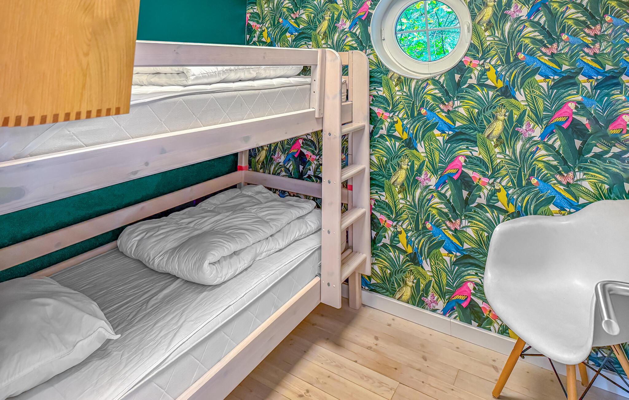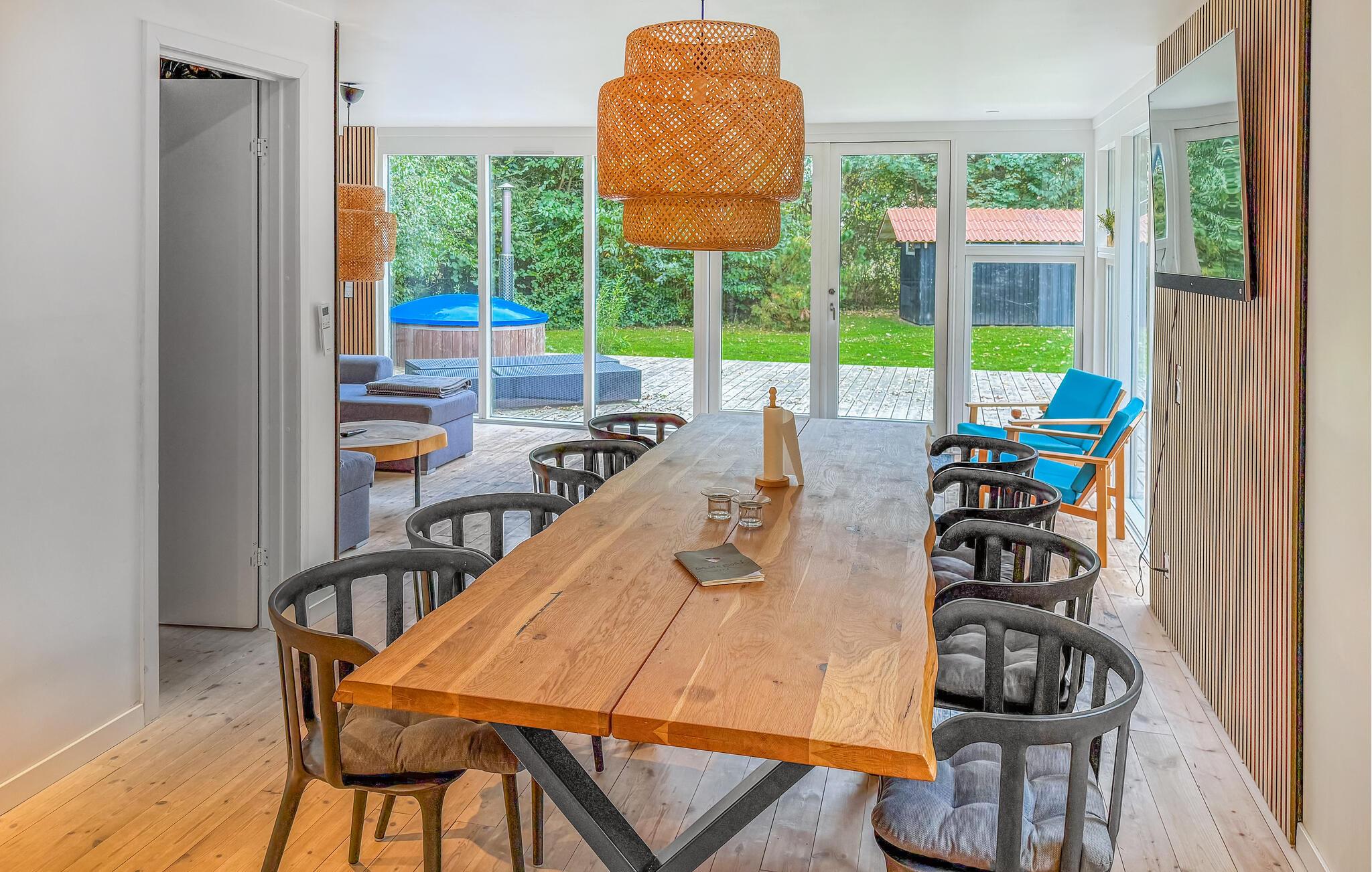 Genießen Sie entspannte Tage in Ihrem geschmackvoll eingerichteten Ferienhaus, das auf einem ruhigen, grünen Grundstück liegt und viel Platz für gemeinsame Momente bietet. Betreten Sie das Haus und lassen Sie sich vom modernen, nordischen Design empfangen. Die großen Fensterfronten schaffen lichtdurchflutete Räume mit Blick ins Grüne. Machen Sie es sich auf dem großen Ecksofa bequem oder genießen Sie Ihre Mahlzeiten am langen Holztisch. Die stilvolle Einrichtung mit warmen Holzelementen und gemütlichen Lichtquellen sorgt für eine angenehme Atmosphäre. In der offenen Küche mit viel Arbeitsfläche und modernen Geräten lässt sich bequem kochen.