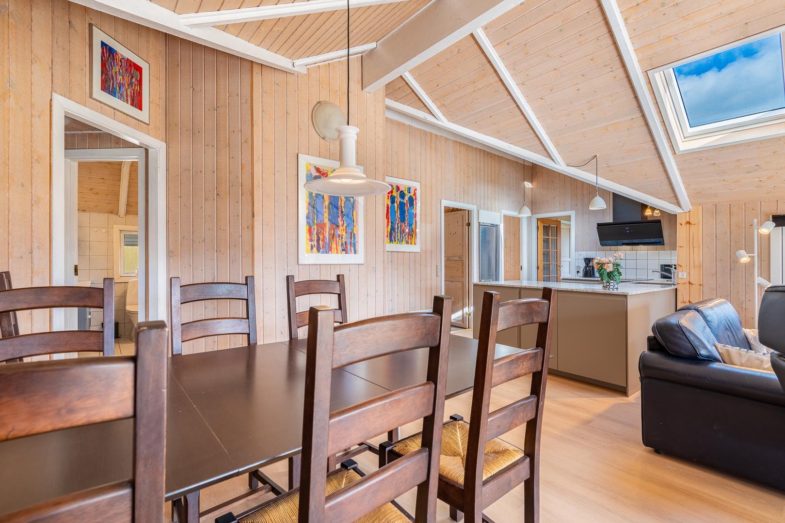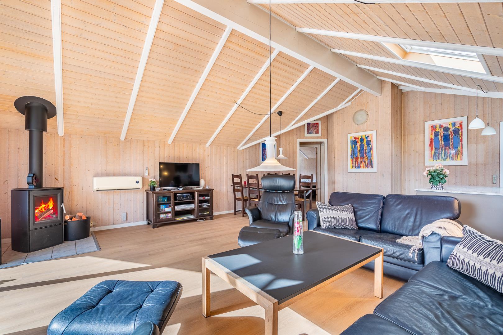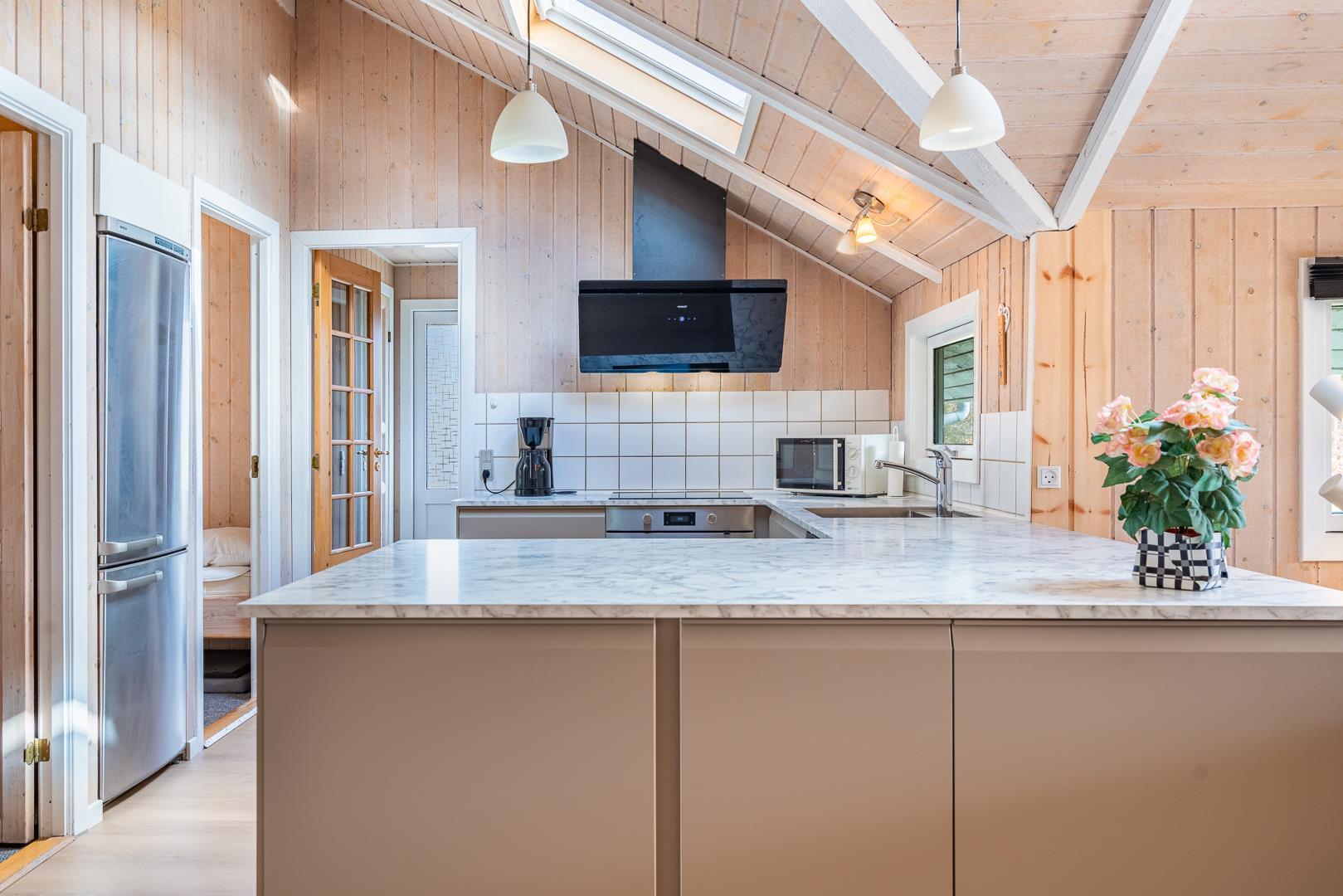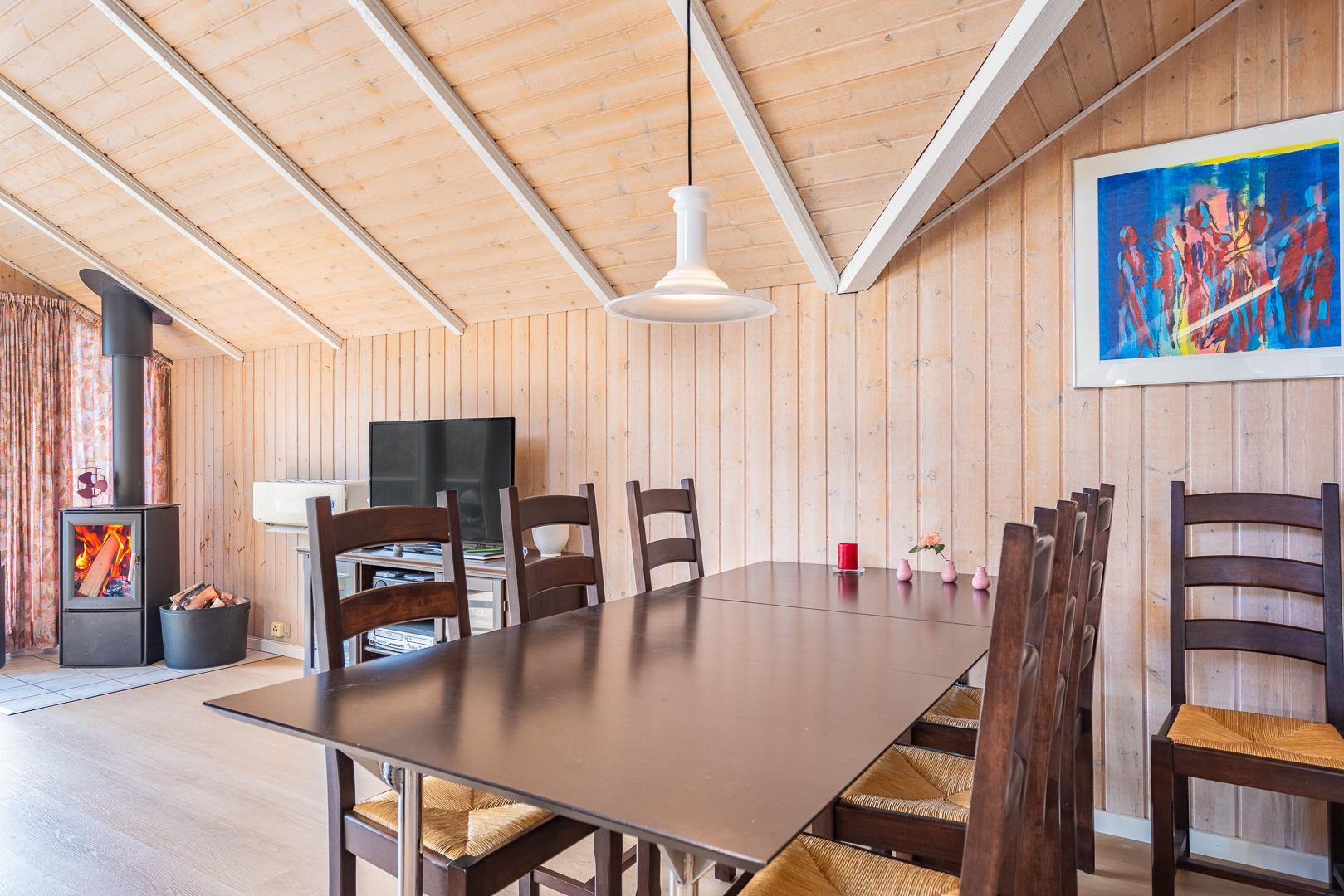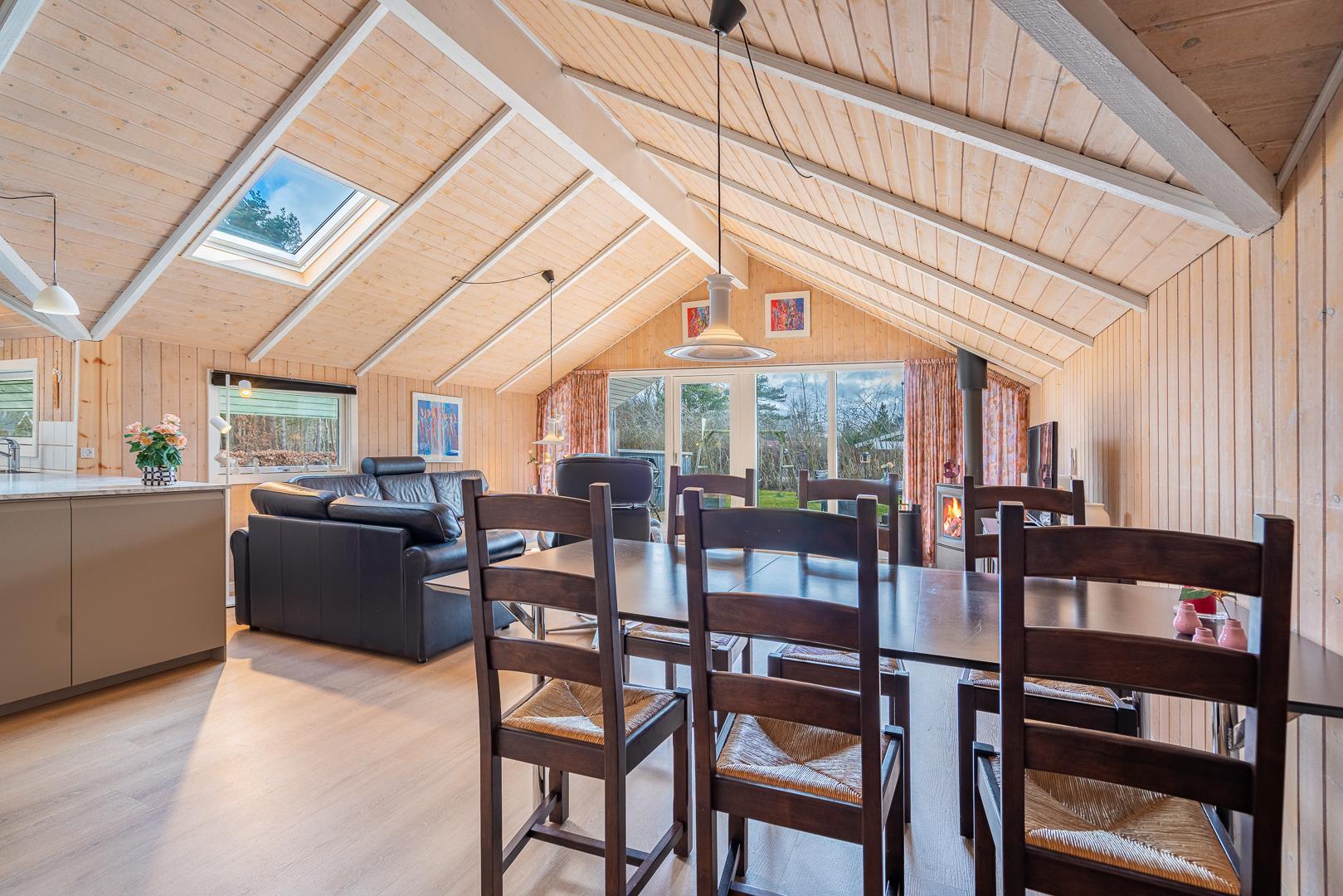 Im Mittelpunkt des Ferienhauses liegt der helle Wohnbereich, in dem der Kamin an kühlen Tagen für wohlige Wärme sorgt. Ergänzt wird er durch eine effiziente Wärmepumpe, die das ganze Jahr über ein angenehmes Raumklima schafft. Die neue, offene Küche ist mit allem ausgestattet, was ihr im Urlaub in Dänemark braucht: eine Spülmaschine erleichtert den Abwasch und am großen Esstisch findet ihr alle Platz für gemeinsame Mahlzeiten.