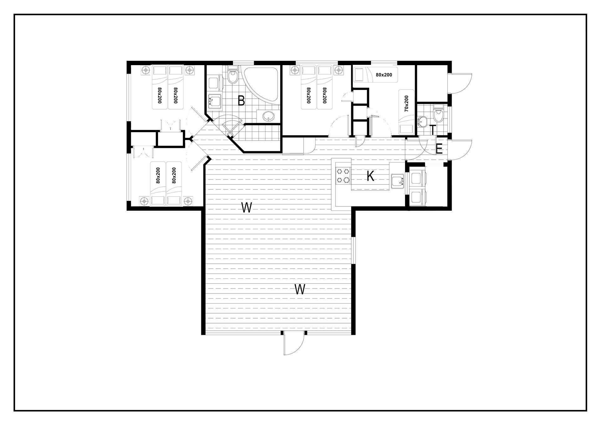 Bettengrösse: 3 Doppelbetten mit je 2 Matratzen á 80 x 200 cm + 1 Einzelbett 80 x 200 cm + 1 Einzelbett 70 x 200 cm.