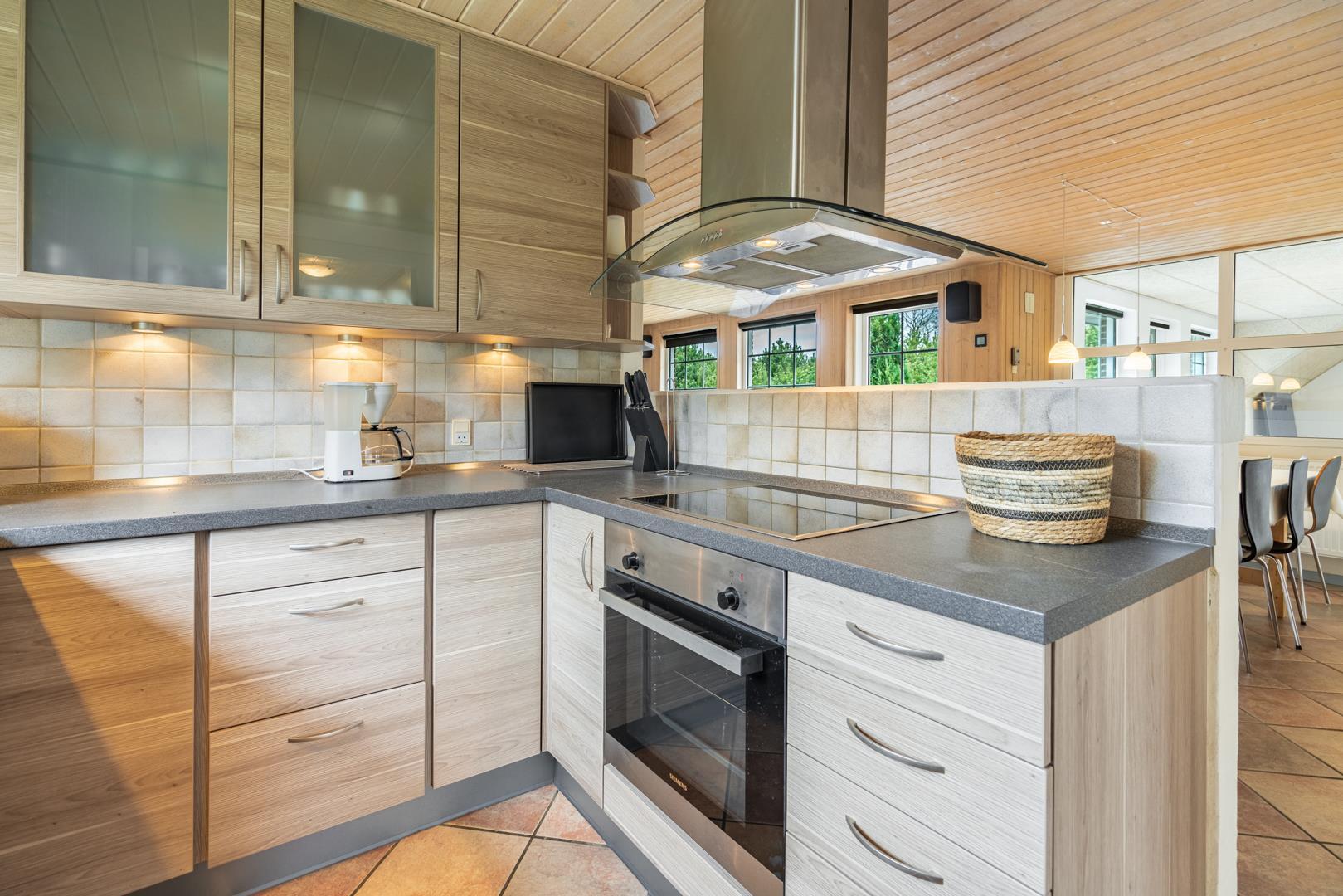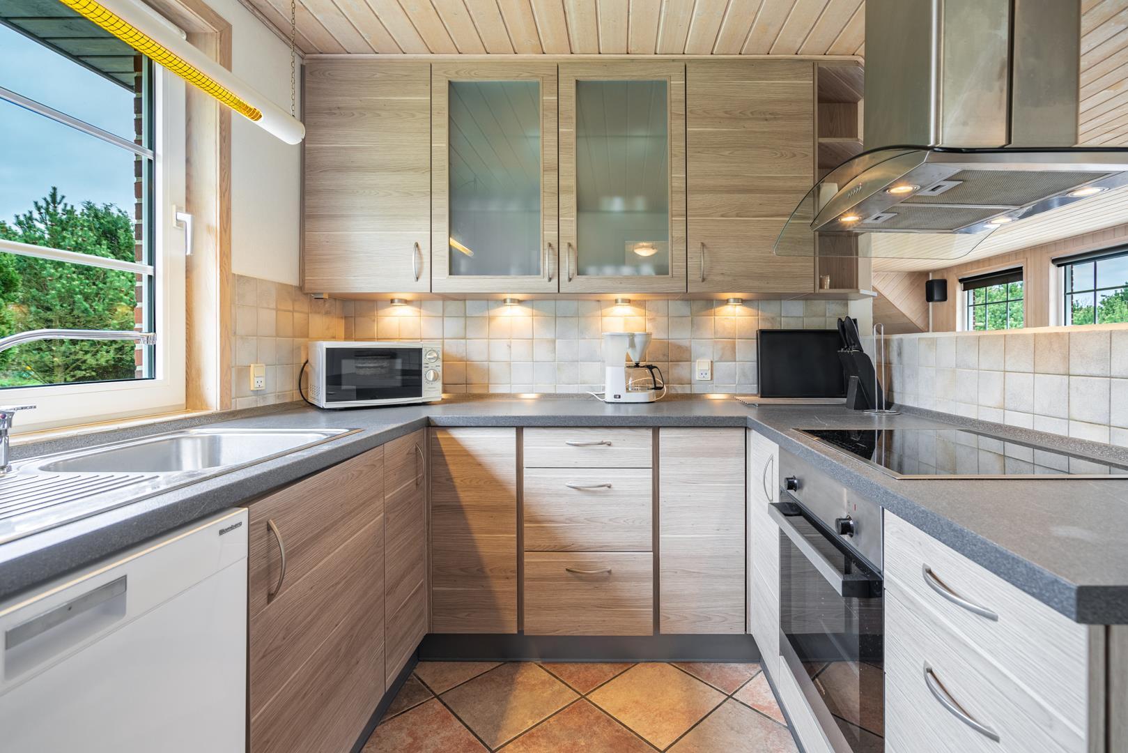 Im Herzstück des Ferienhauses erwartet dich ein heller Wohnraum mit Fußbodenheizung, Kamin und Wärmepumpe – ideal für gemütliche Stunden an kühlen Abenden. Die moderne Küche mit Spülmaschine, einem zusätzlichen 40-Liter-Gefrierfach und viel Platz zum gemeinsamen Kochen macht Selbstverpflegung leicht. Auch hier sorgt Fußbodenheizung für wohlige Wärme.