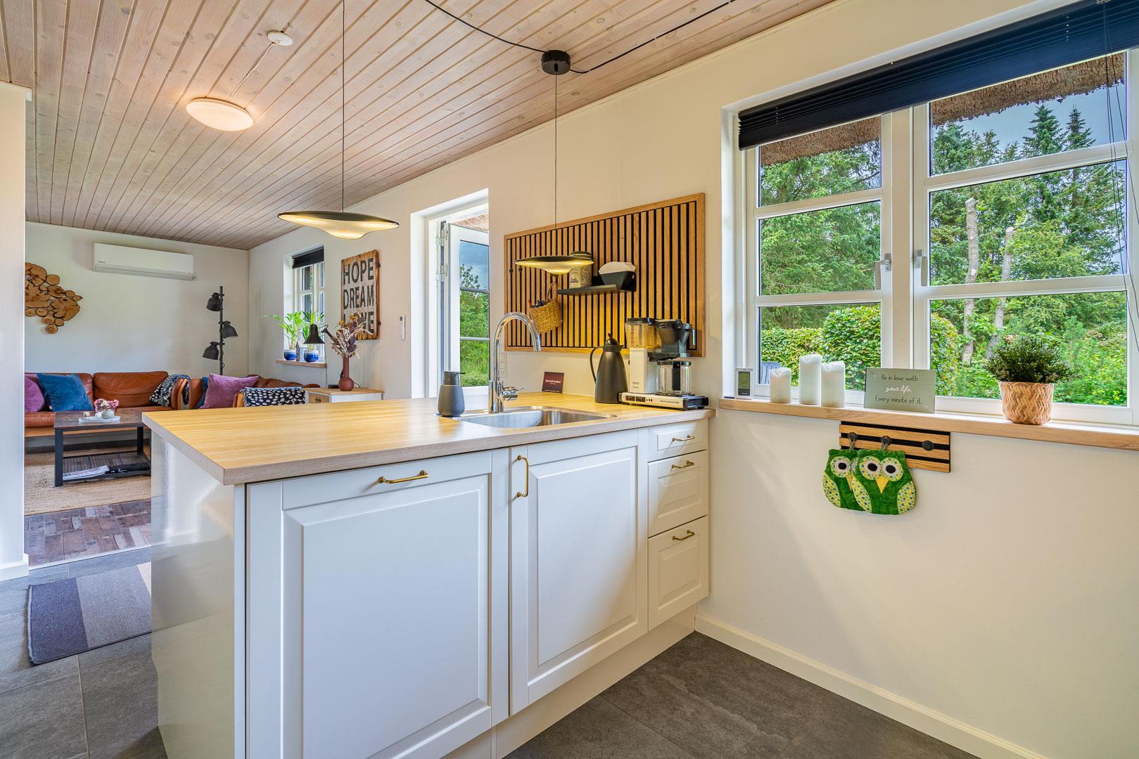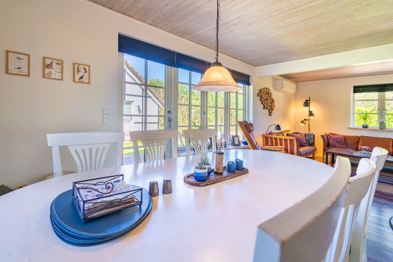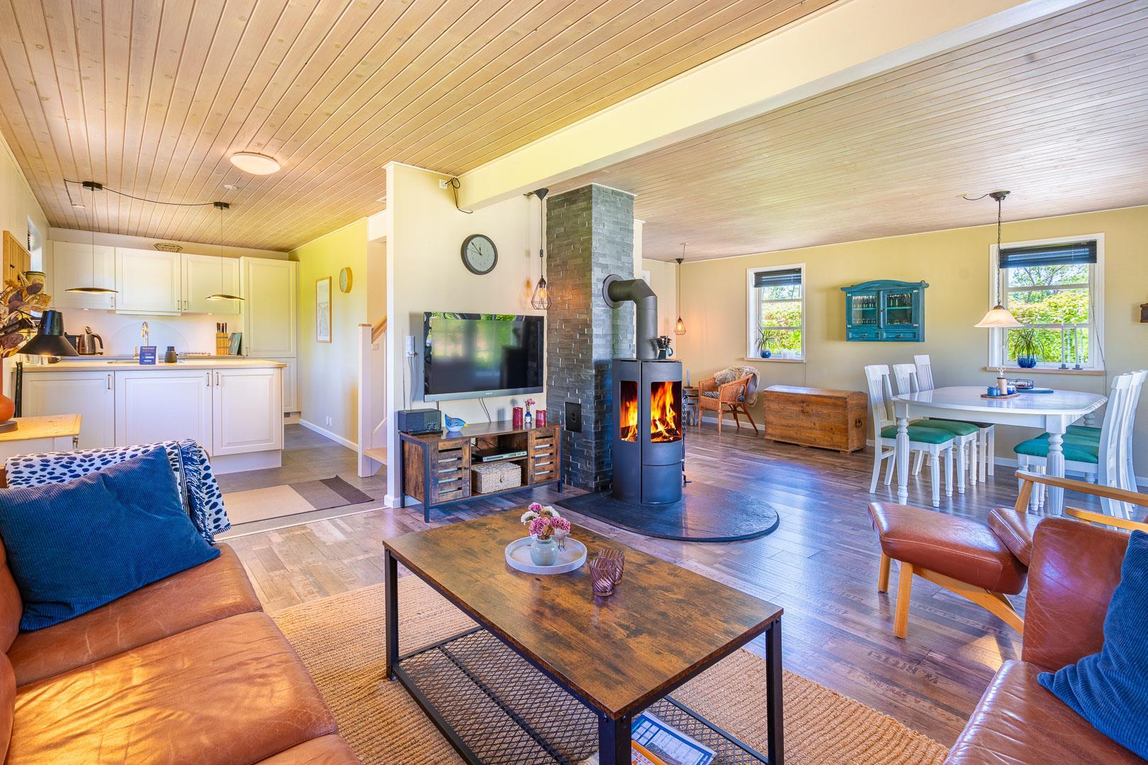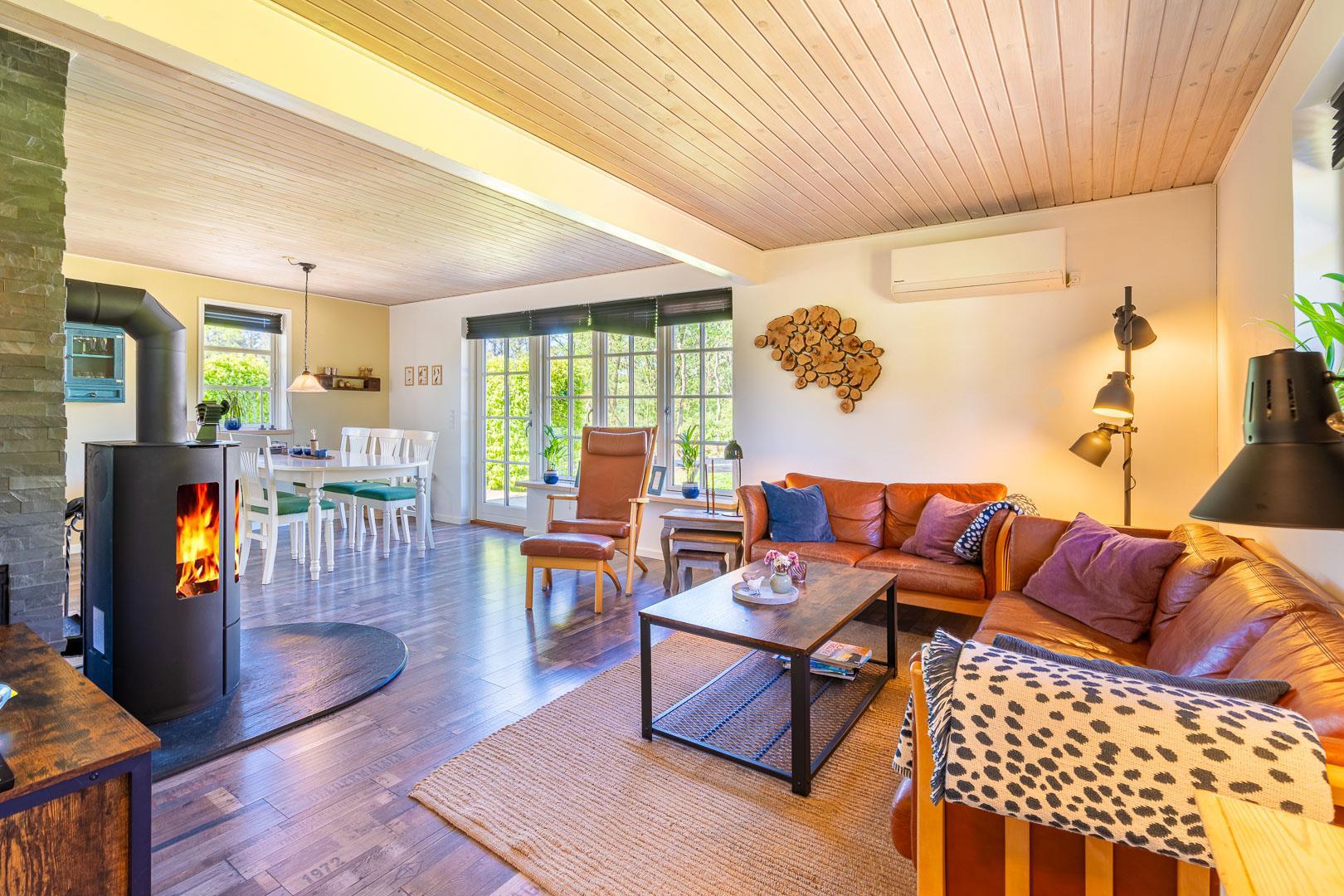 Das Ferienhaus wurde laufend modernisiert und vereint gemütliches dänisches Design mit modernen Annehmlichkeiten. Im offenen Wohn- und Essbereich sorgen große Fenster für viel Licht und der Kamin für wohlige Wärme. Zusätzlich schafft eine Wärmepumpe ein angenehmes Raumklima – nachhaltig und energiesparend.