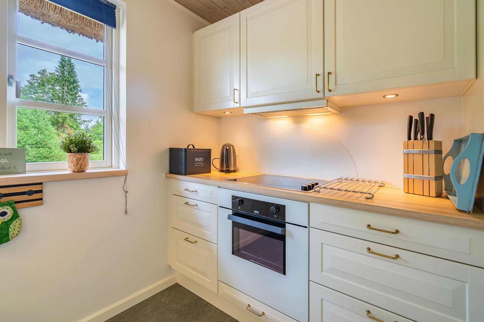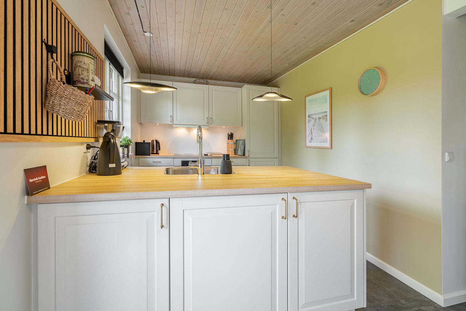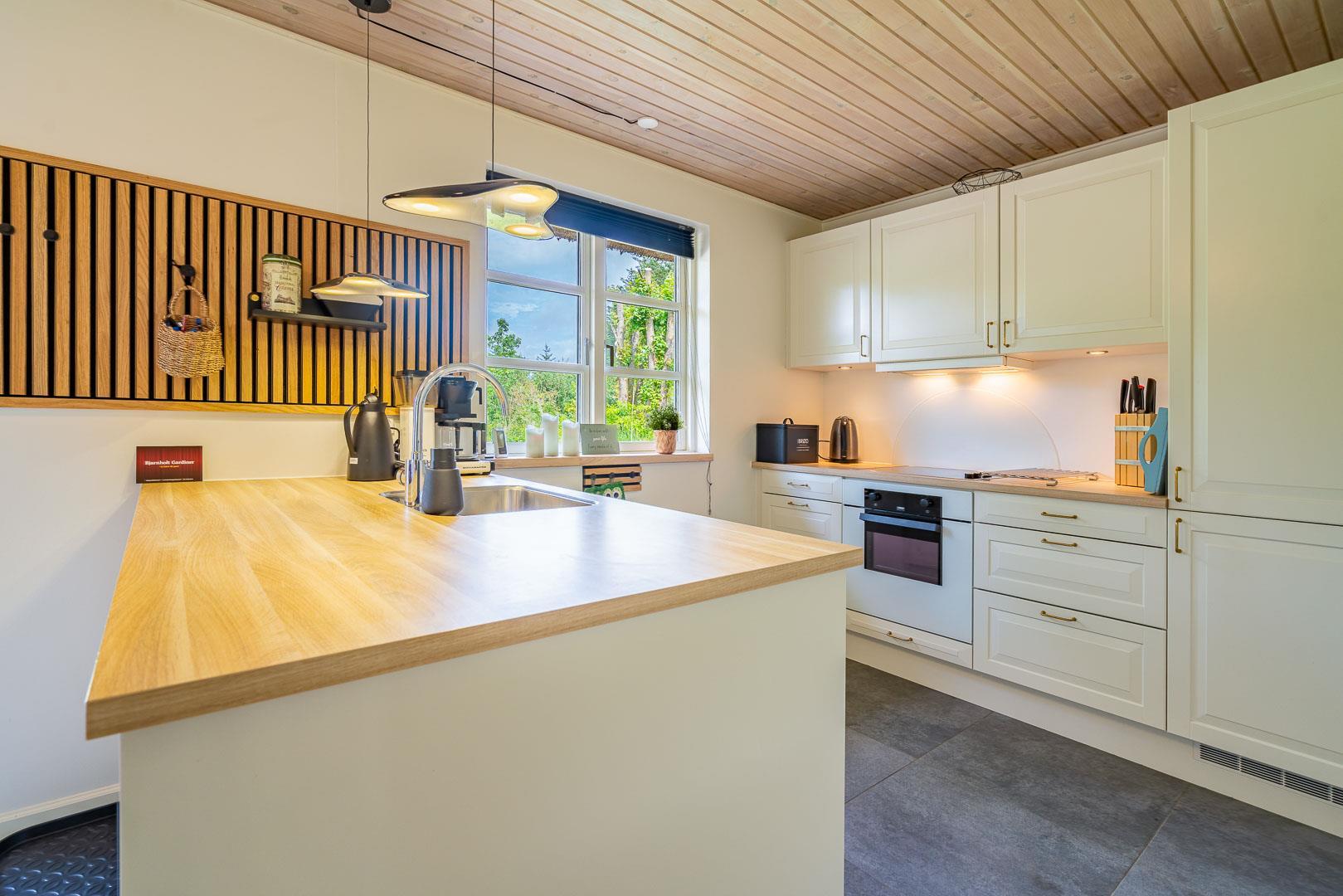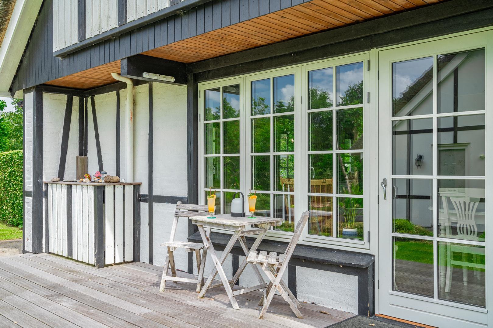 Das Ferienhaus wurde laufend modernisiert und vereint gemütliches dänisches Design mit modernen Annehmlichkeiten. Im offenen Wohn- und Essbereich sorgen große Fenster für viel Licht und der Kamin für wohlige Wärme. Zusätzlich schafft eine Wärmepumpe ein angenehmes Raumklima – nachhaltig und energiesparend.