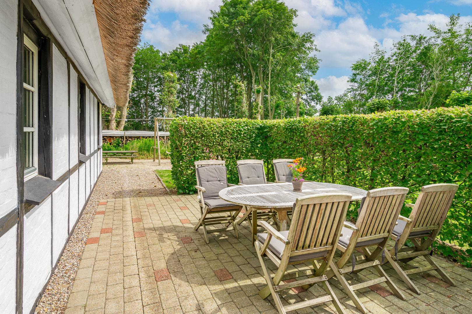Im Außenbereich von Møllevangen 22 erwartet euch eine große Terrasse mit Gartenmöbeln – perfekt für das Frühstück in der Morgensonne oder gemütliche Abende mit der Familie. Die Kinder freuen sich über eine Schaukel und einen Sandkasten, während sich euer Hund vom langen Spaziergang an der Nordsee ausruht.