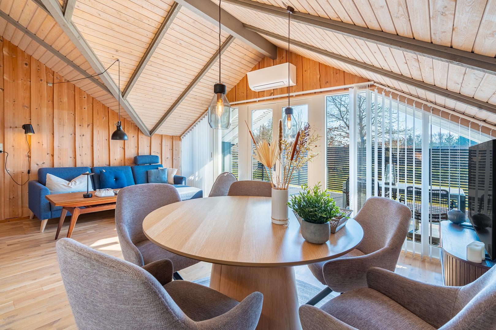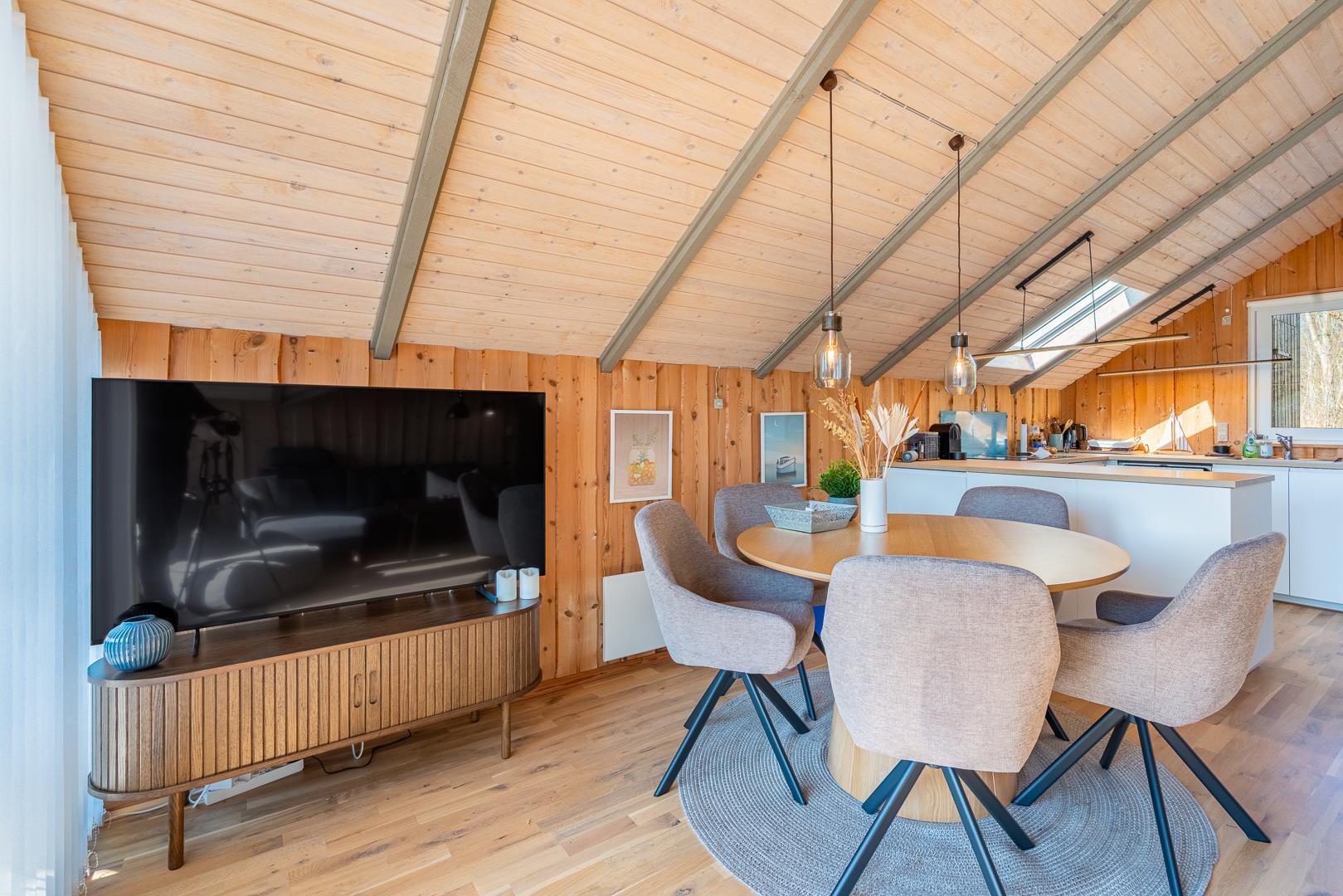 Im Inneren des Ferienhauses erwartet dich eine helle, freundliche Atmosphäre, die sofort Urlaubsstimmung aufkommen lässt. Der Wohnraum ist harmonisch gestaltet und verbindet Sitzecke, Essbereich und Küche zu einem gemütlichen Mittelpunkt – ideal für deinen Ferienhausurlaub an der dänischen Nordseeküste. Eine Wärmepumpe sorgt für ein angenehmes Raumklima zu jeder Jahreszeit.