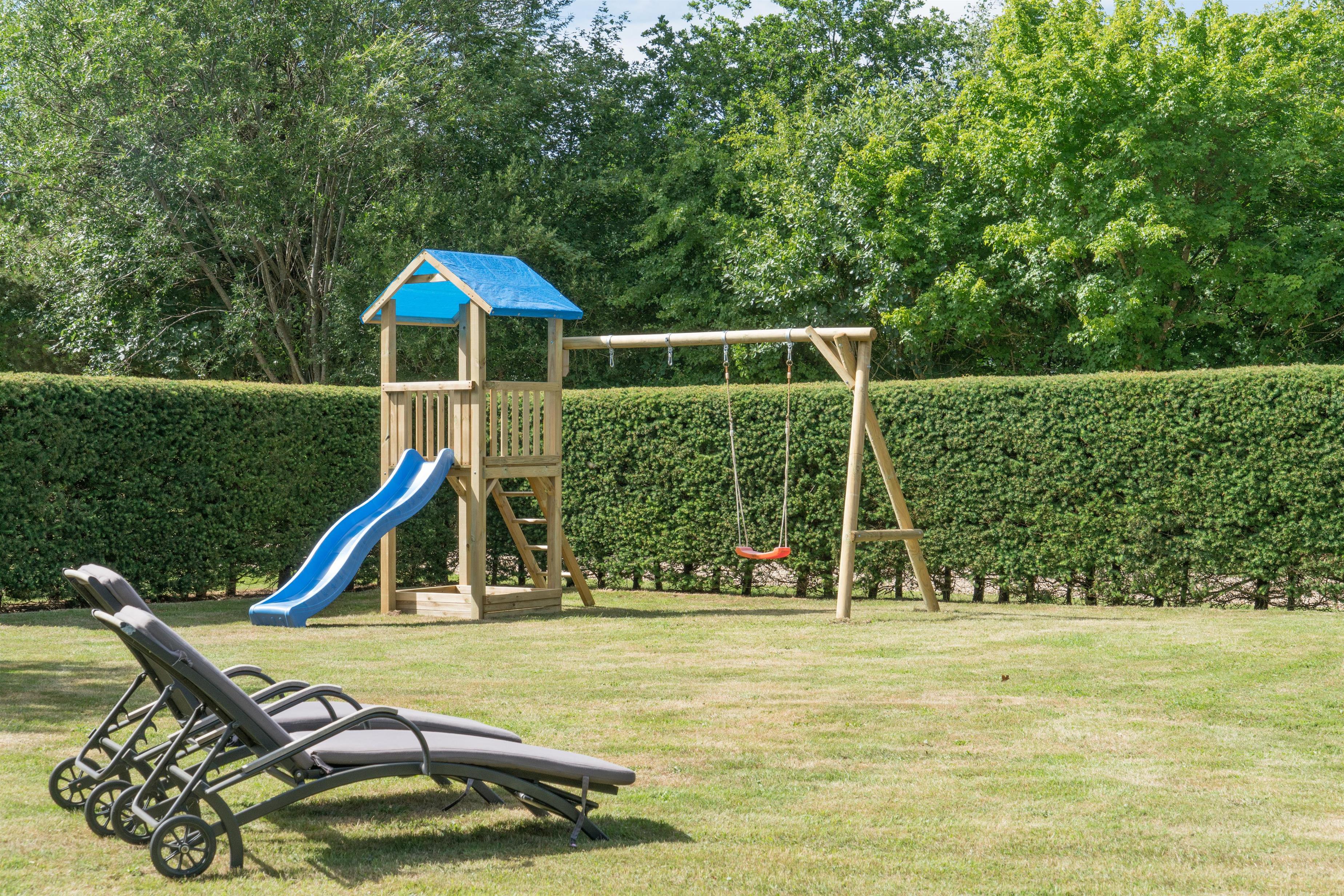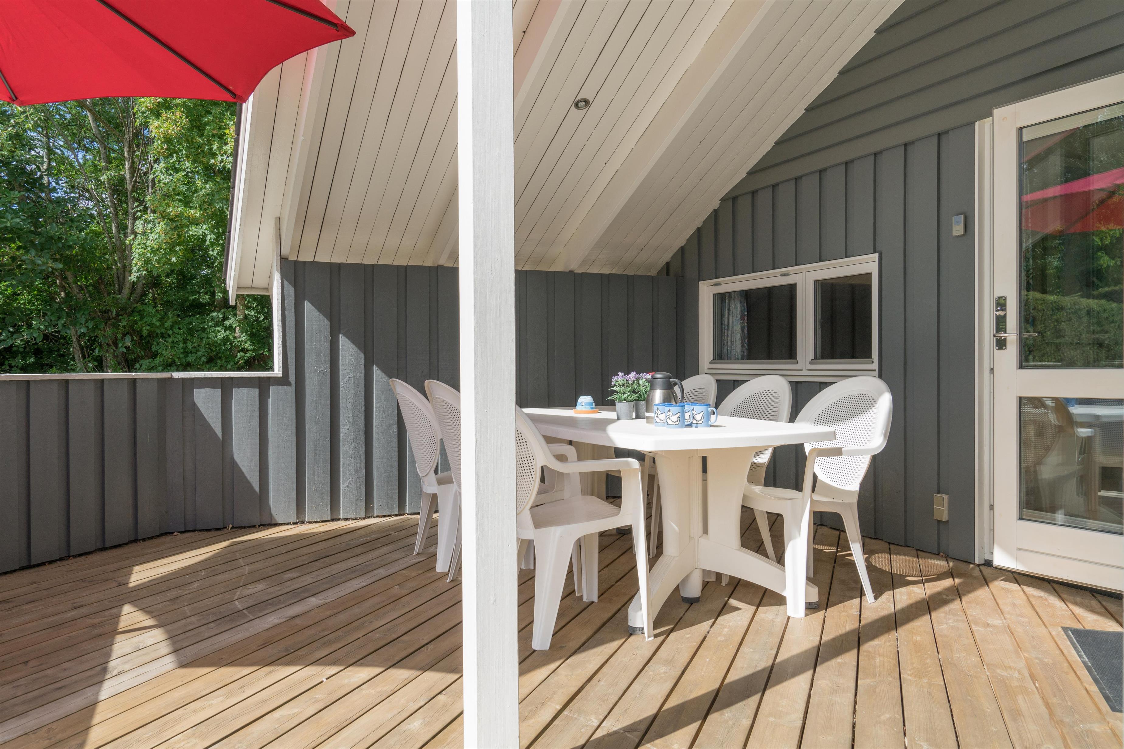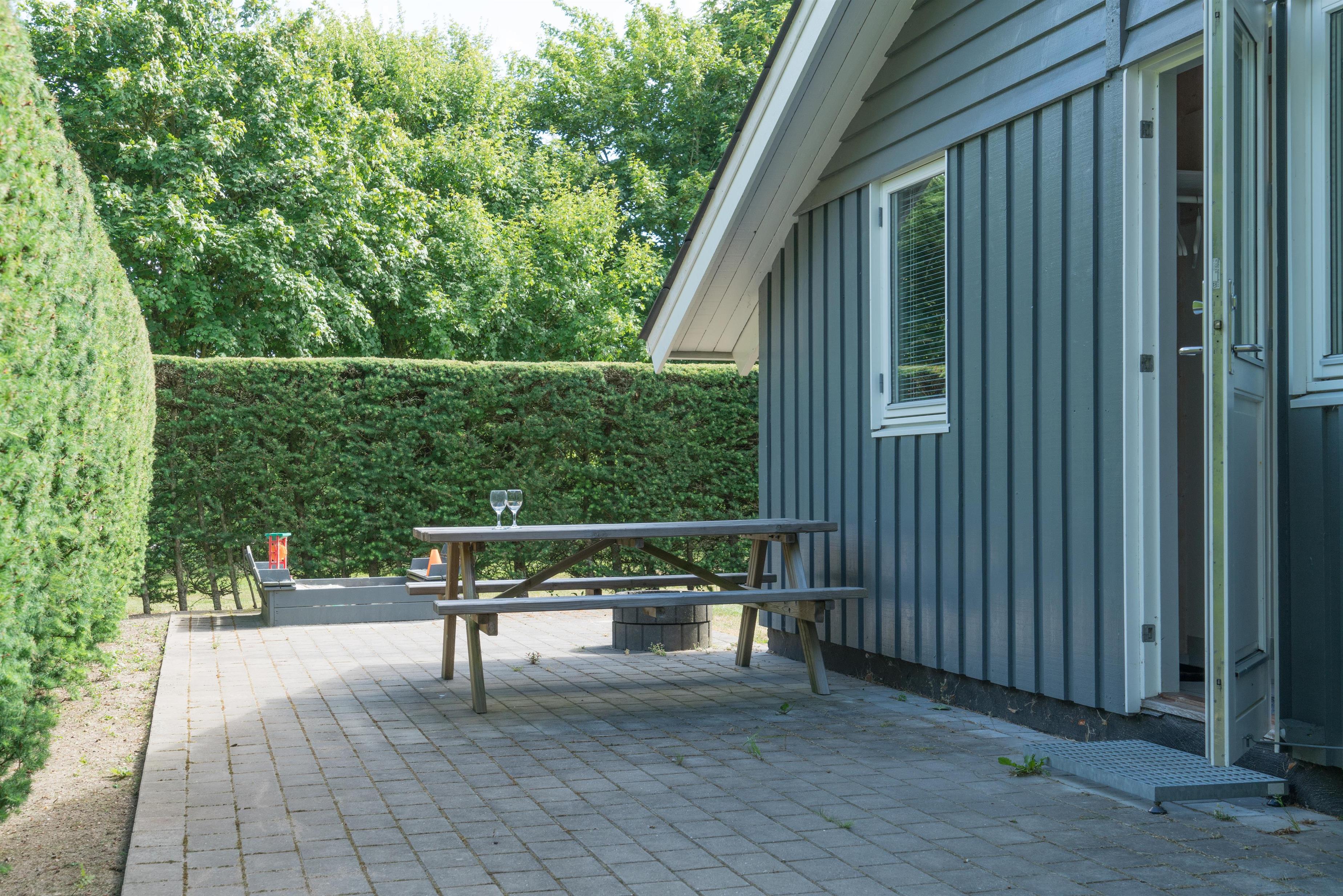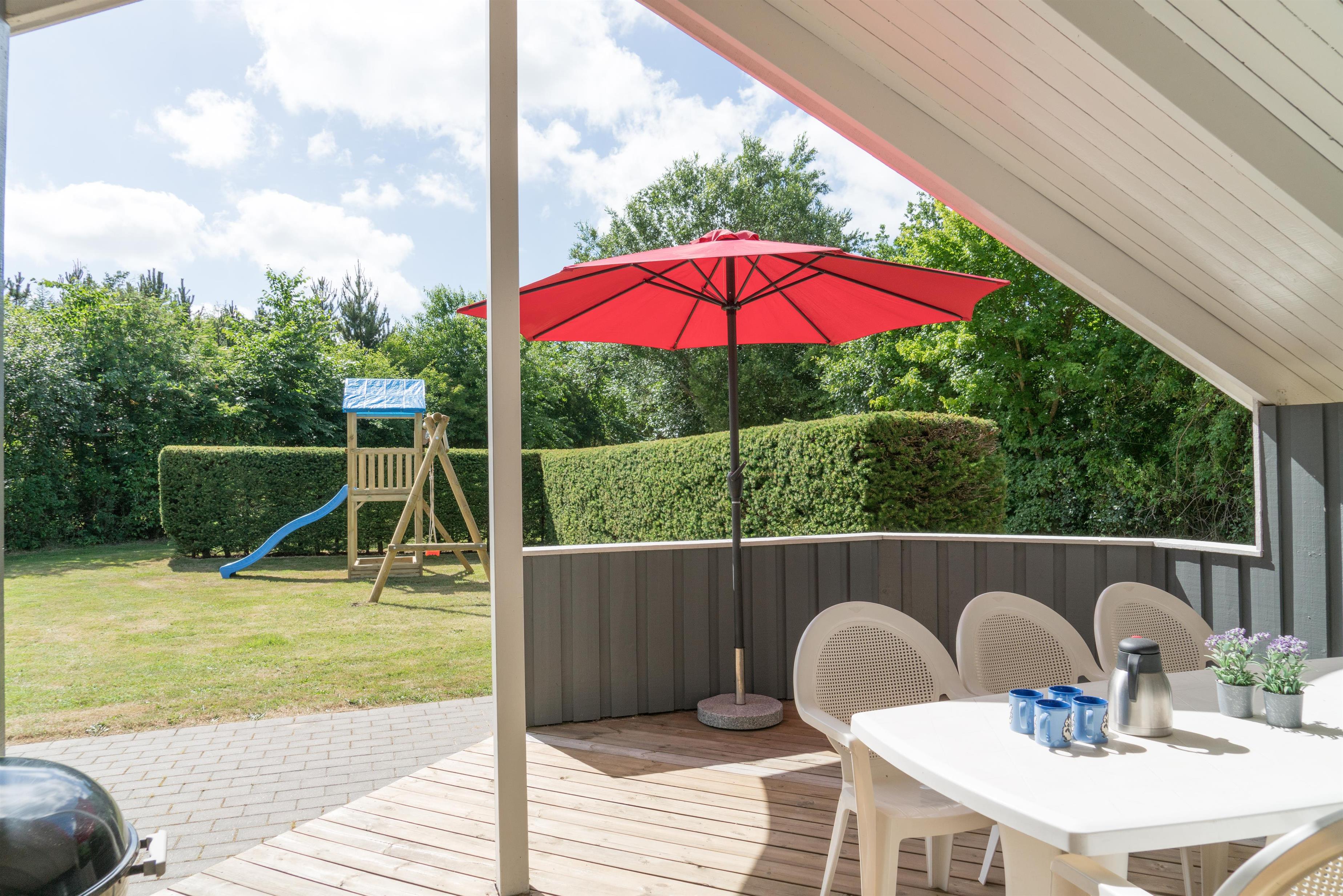 Eine überdachte Terrasse für gemütliche Morgenstunden, ein Sandkasten und eine Schaukel für Kinder – ideal für Familien, die ein kinderfreundliches Ferienhaus suchen.