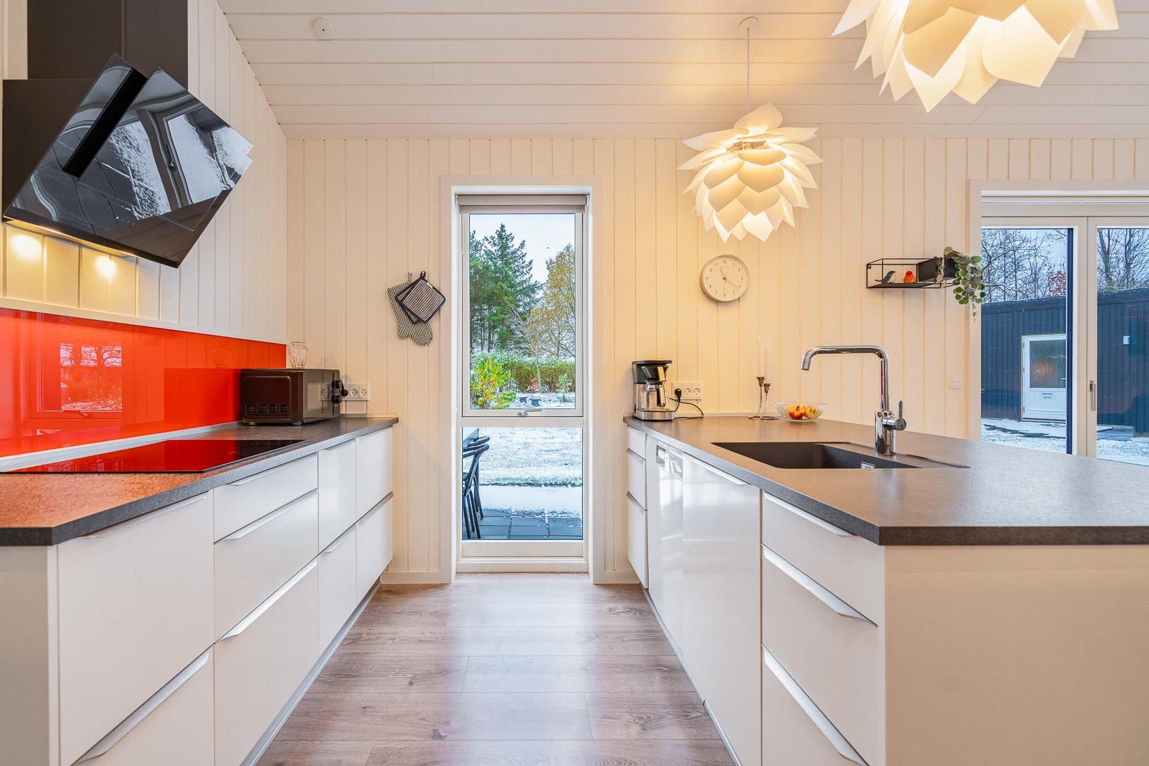 Die offene Küche ist modern ausgestattet – unter anderem auch mit einer Spülmaschine. Hier kocht ihr entspannt, während im Hintergrund das Feuer knistert oder die Kinder sich auf dem Hems eine kleine Auszeit gönnen.