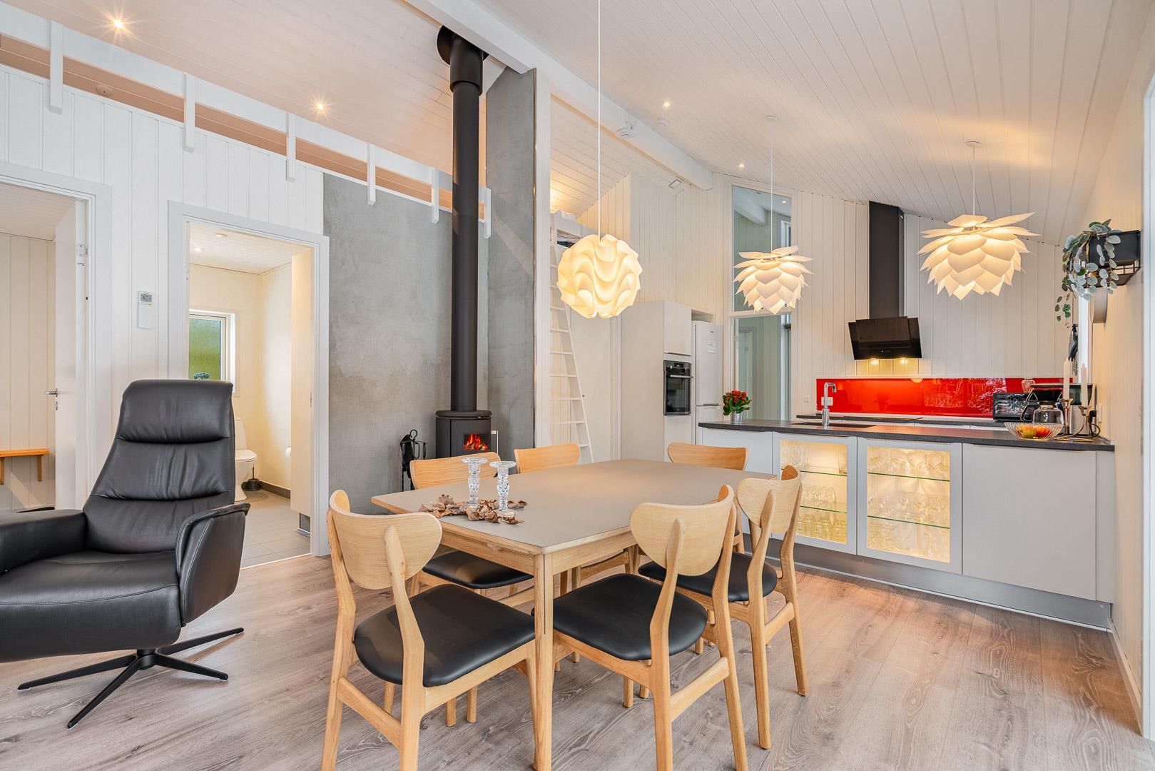 Im offenen Wohnbereich sorgt ein Kamin für behagliche Stunden, besonders an kühlen Tagen oder abends nach einem langen Spaziergang am Meer. Eine moderne Wärmepumpe hält das Raumklima angenehm – energiesparend und komfortabel. Große Fenster erschaffen hier eine helle, freundliche Atmosphäre und verbinden Wohnraum und Natur auf harmonische Weise.
