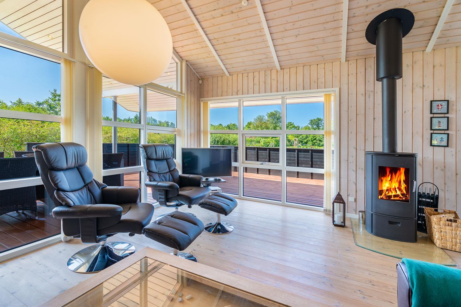 Das Ferienhaus überzeugt durch eine Kombination aus Gemütlichkeit und Funktionalität. Der helle Wohnbereich lädt mit einem Kamin, Chromecast und einer Wärmepumpe zu entspannten Stunden ein – ganz gleich ob im Sommer oder Winter. Es steht außerdem eine Spielekonsole bereit – ideal für Familien mit Kindern oder Jugendlichen.