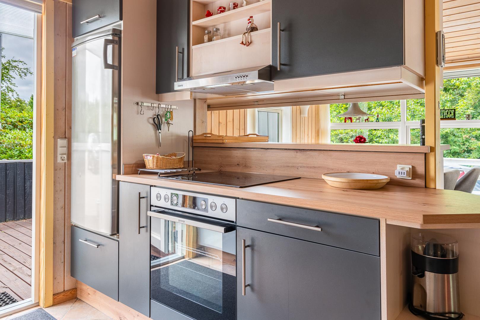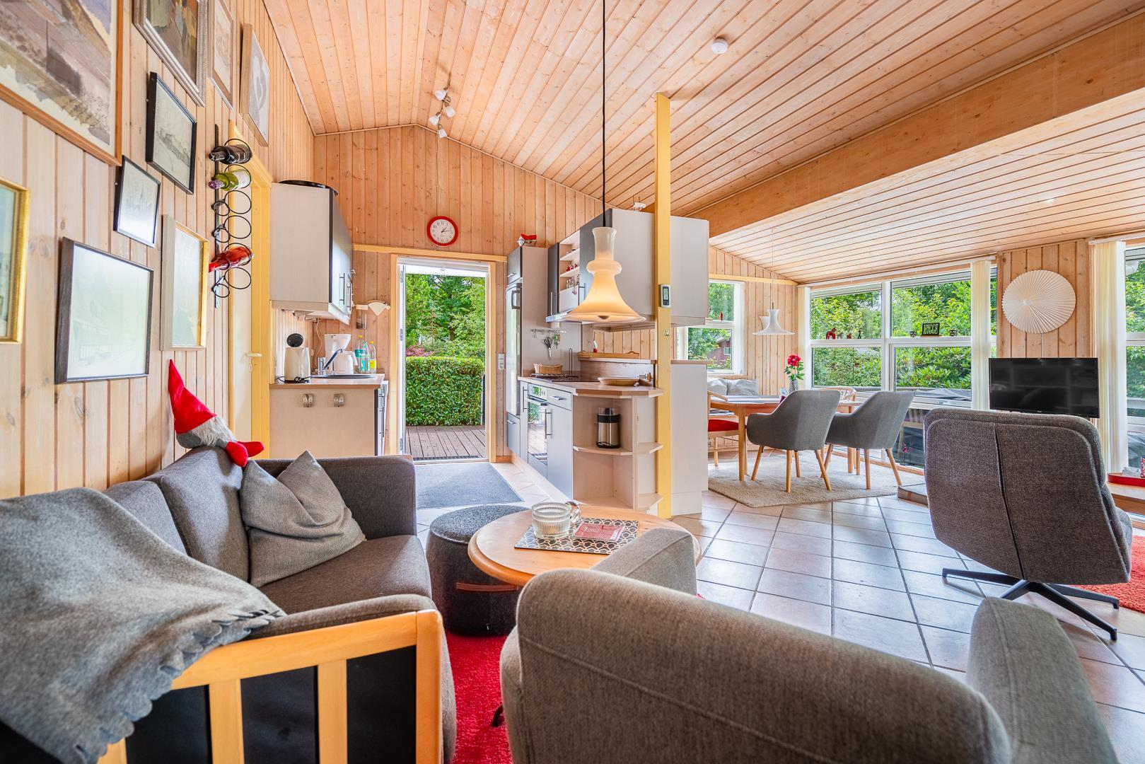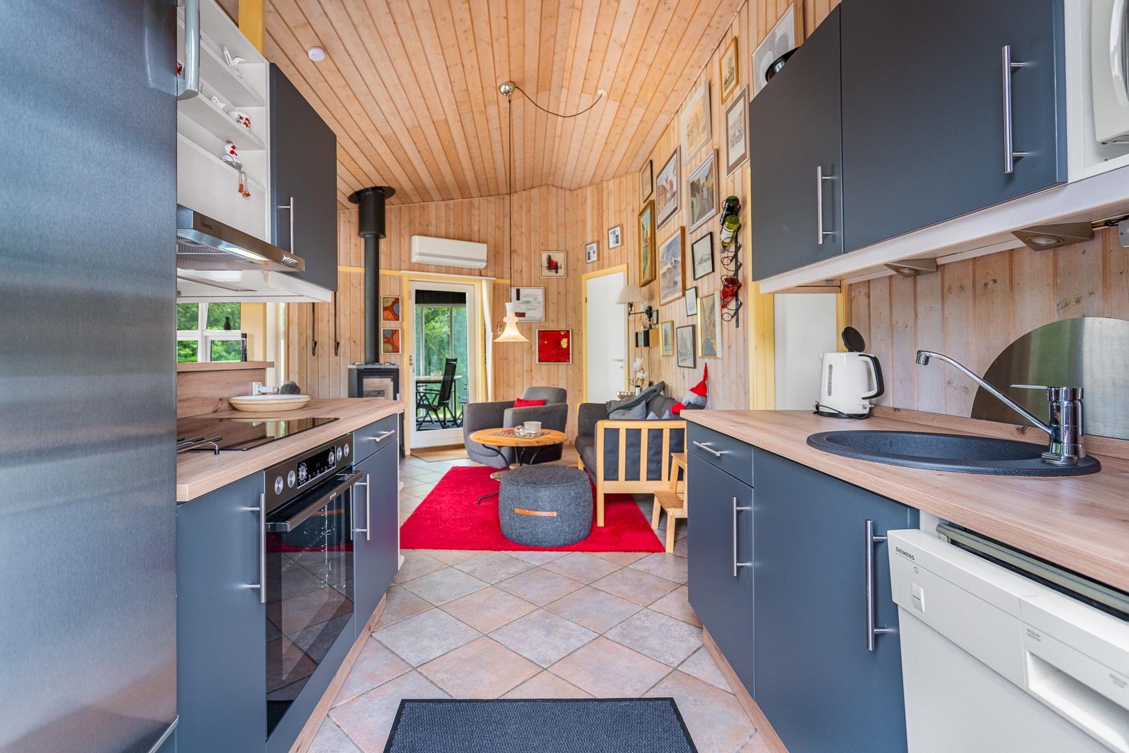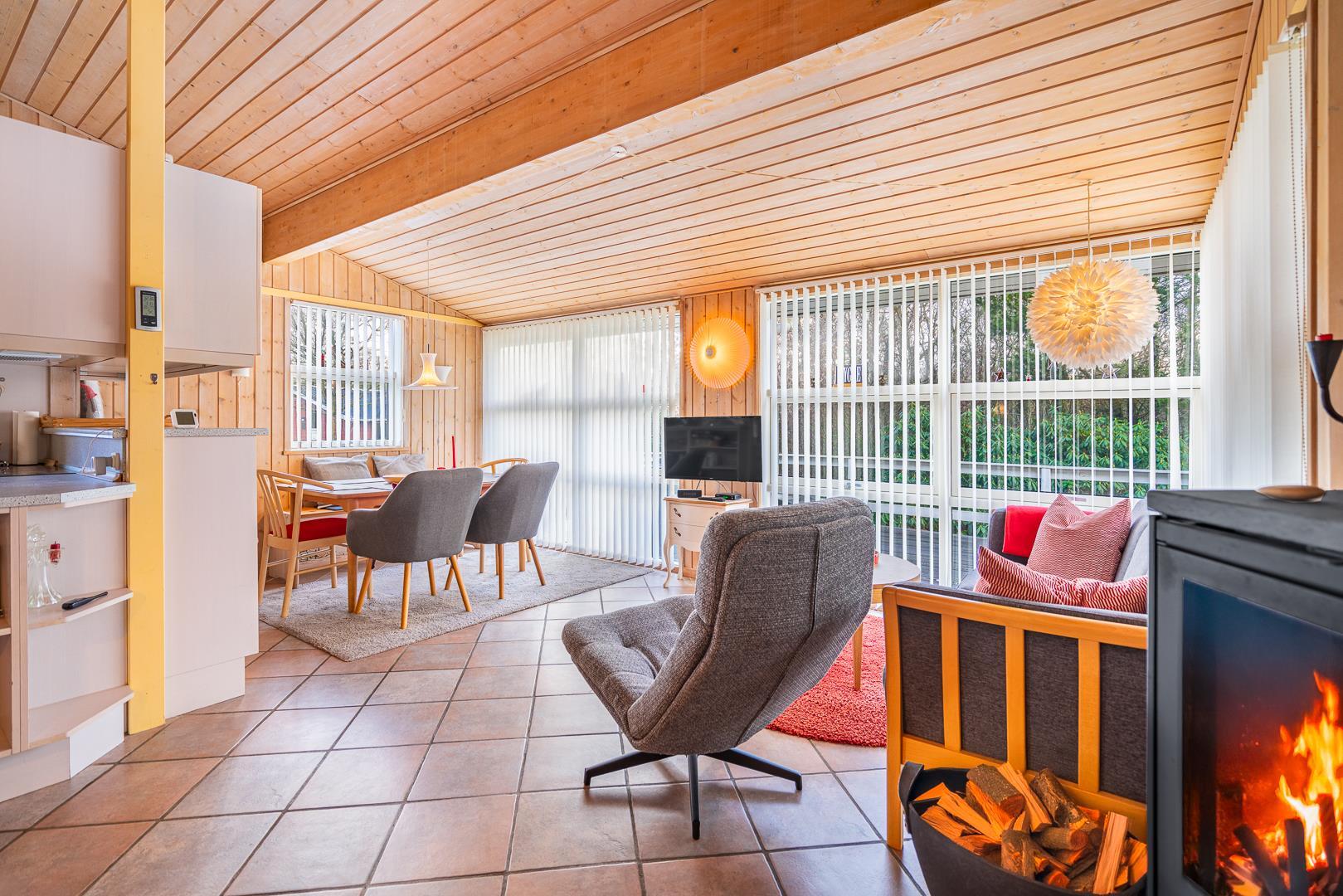 Der helle und freundliche Wohnbereich lädt zum Verweilen ein: Macht es euch am Kamin gemütlich oder genießt das angenehme Raumklima dank Wärmepumpe. Die offene Küche ist mit allem ausgestattet, was ihr benötigt – inklusive Spülmaschine für den Abwasch nach dem Essen.