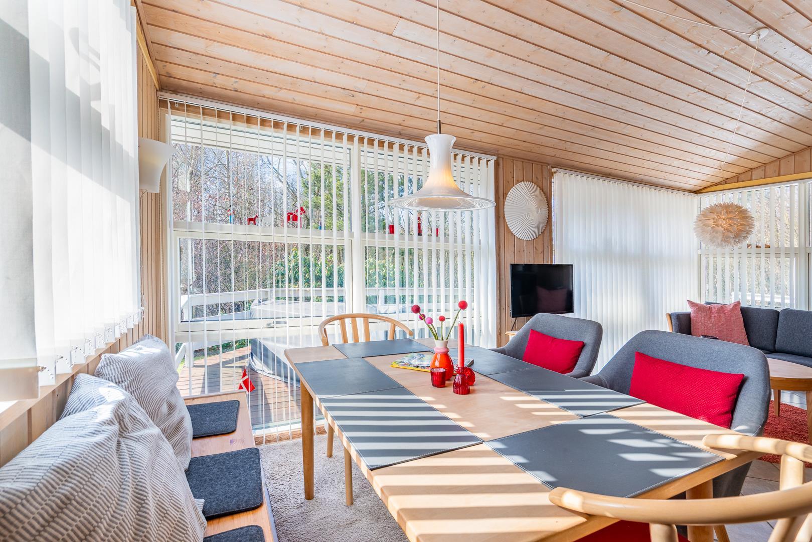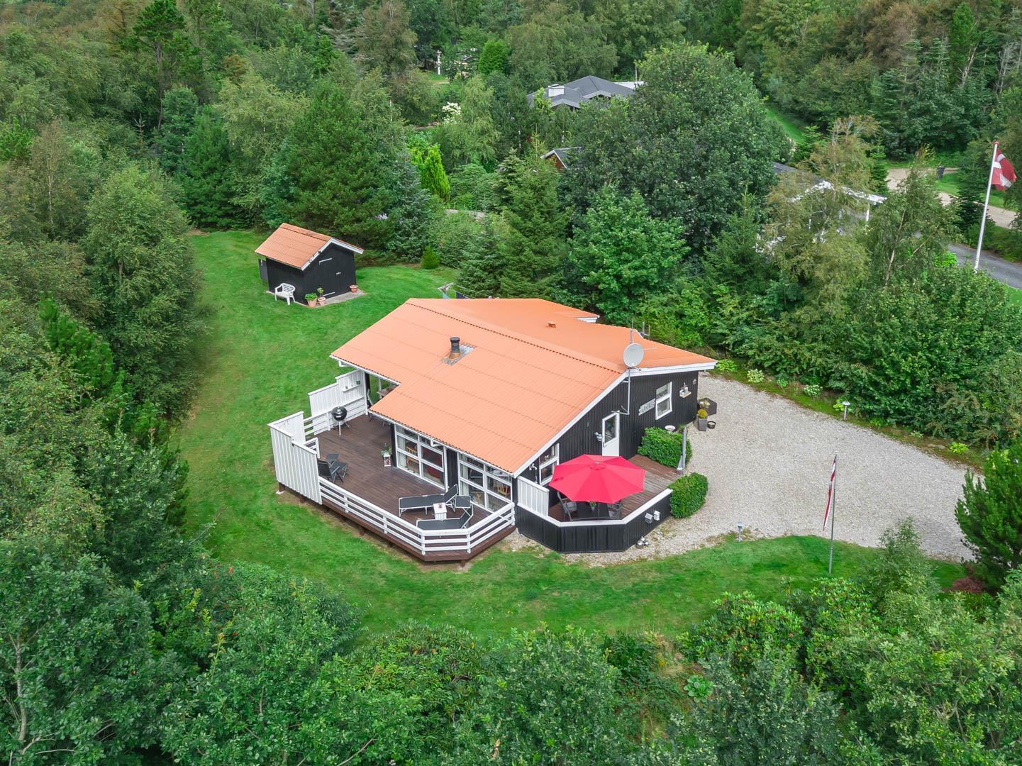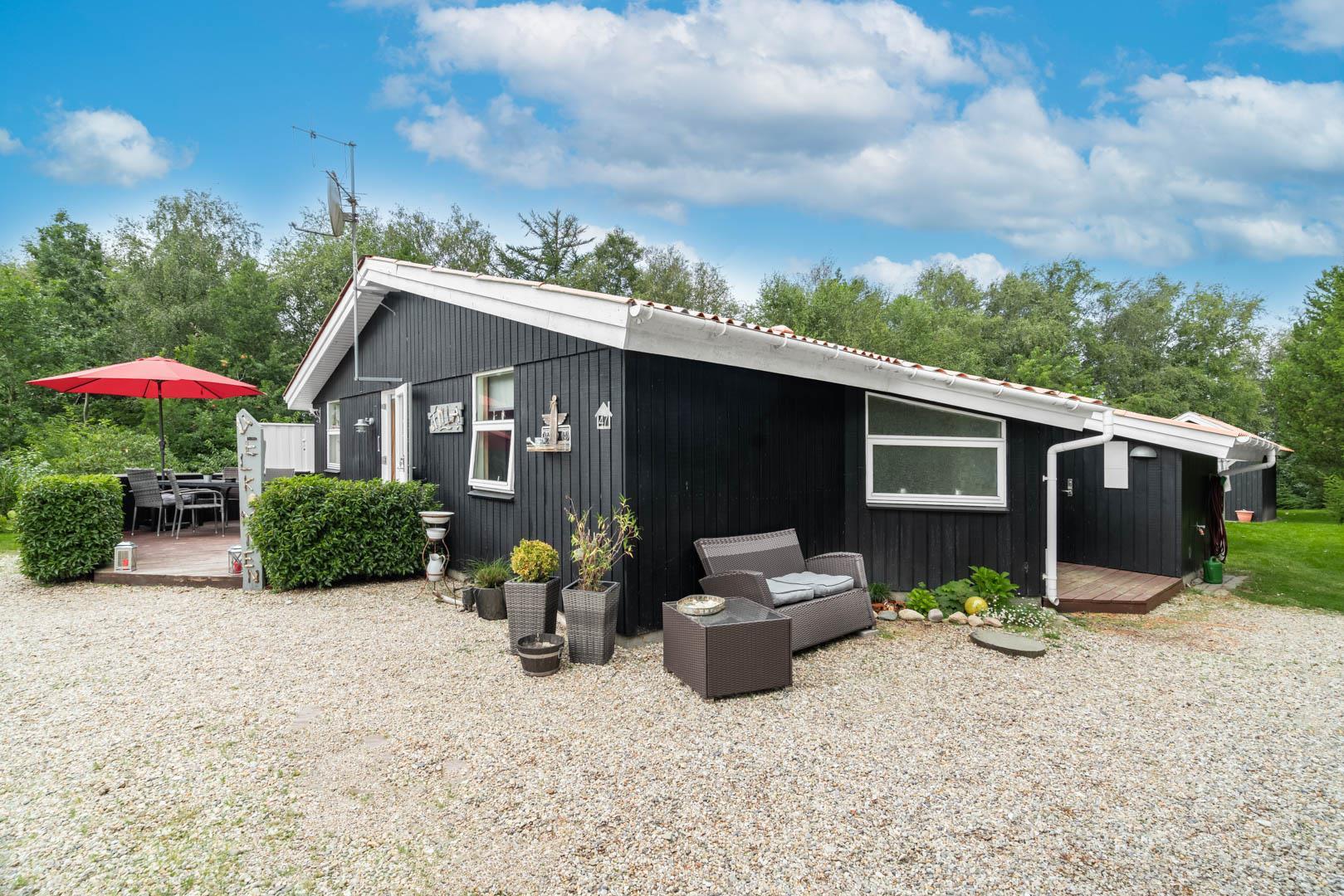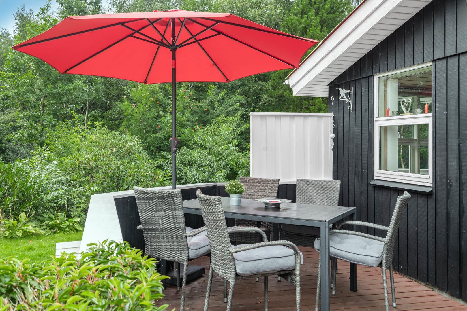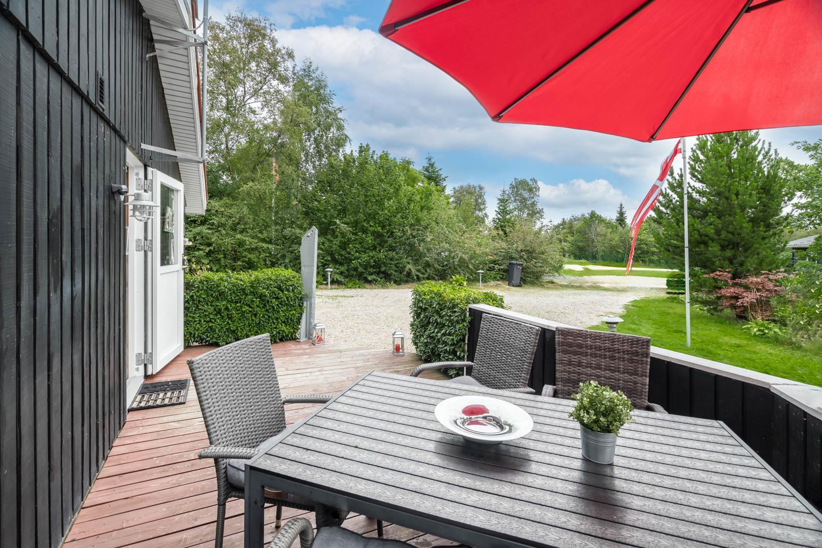 Genießt sonnige Stunden auf den bereitstehenden Sonnenliegen, während die Kinder spielen oder ihr gemeinsam ein ausgiebiges Frühstück an der frischen Luft genießt. Am Abend lädt die Terrasse zum Grillen und geselligen Beisammensein ein – umgeben von der typisch dänischen Naturidylle von Jegum.