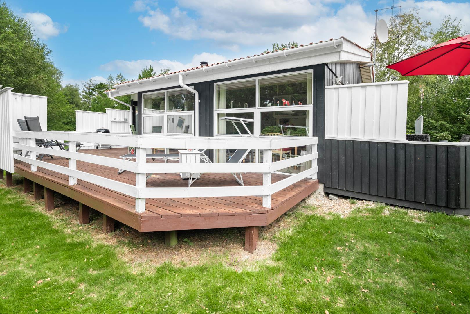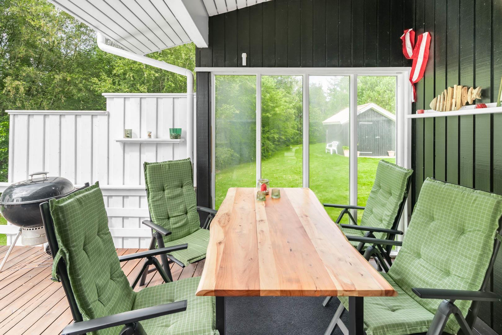 Im Außenbereich dieses Ferienhauses erwartet euch ein echtes Urlaubsparadies. Die geschlossene Terrasse ist ein besonderes Highlight – ideal für Familien mit Kindern und Hundebesitzer. Eure Hunde können sich hier frei und sicher bewegen, während ihr ungestört entspannt.