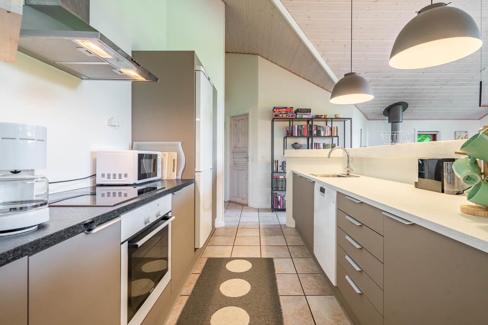 Die offene Küche mit Fußbodenheizung & Spülmaschine ist bestens ausgestattet für gemeinsames Kochen im Urlaub. Angrenzend befindet sich der Essbereich mit Blick auf Terrasse und Garten – ideal für entspannte Urlaubsabende.
