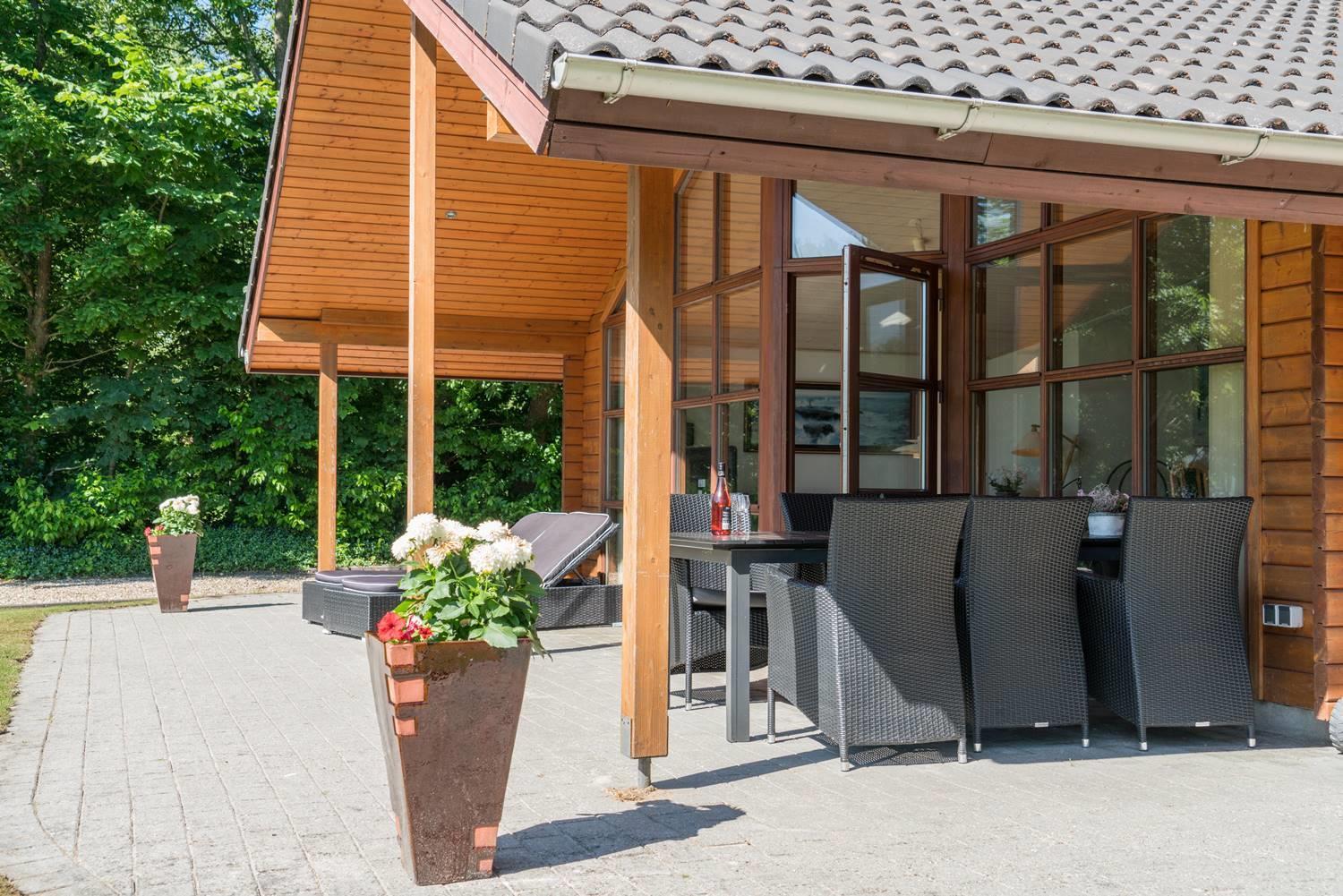 Der Außenbereich dieses Ferienhauses im Jegum Ferieland bietet beste Bedingungen für einen entspannten Urlaub mit Hund in Dänemark. Die überdachte Terrasse lädt zu gemütlichen Stunden im Freien ein – ideal für gemeinsame Mahlzeiten, entspannte Abende oder eine Pause nach einem Strand- oder Ausflugstag.
