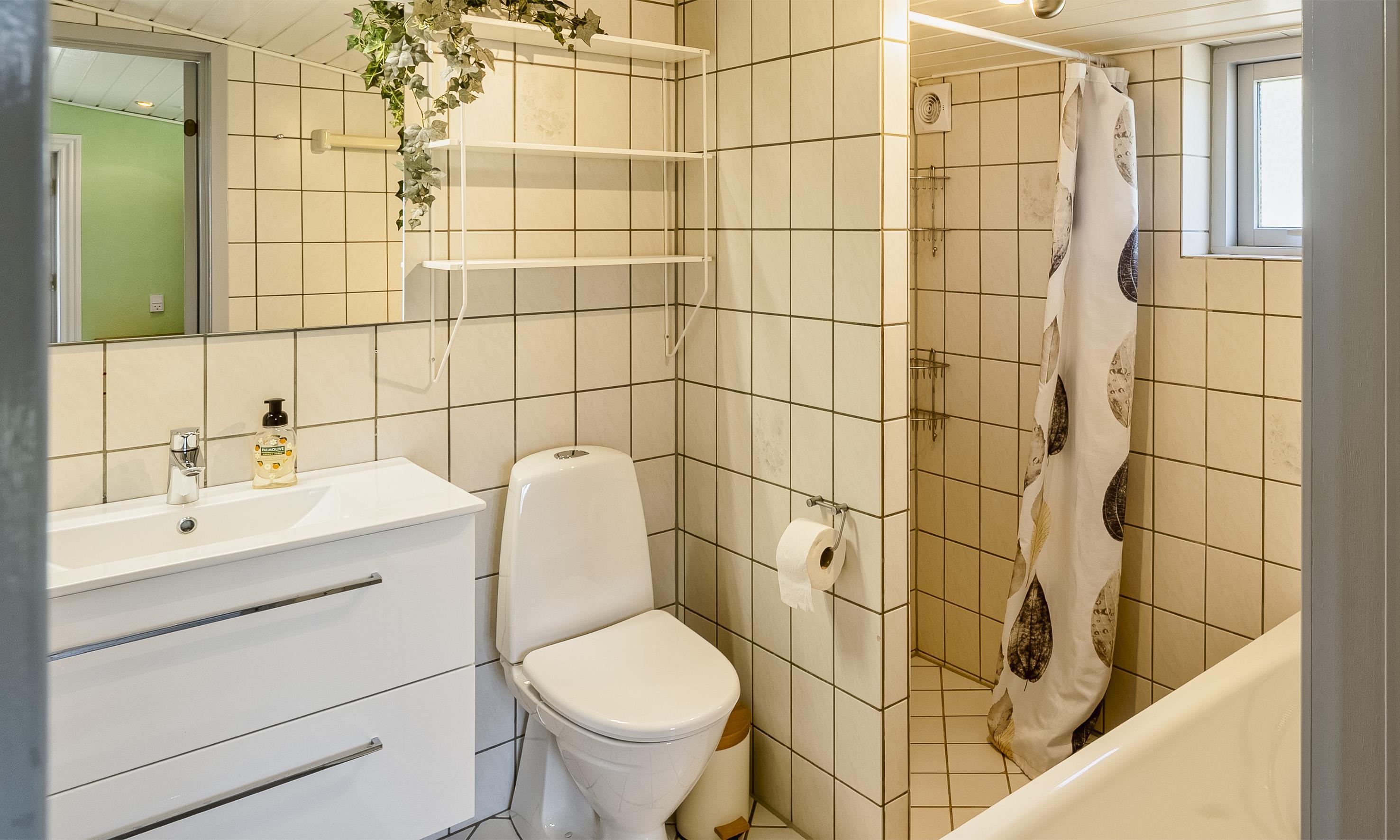 Badezimmer mit Toilette, Dusche und Waschbecken
