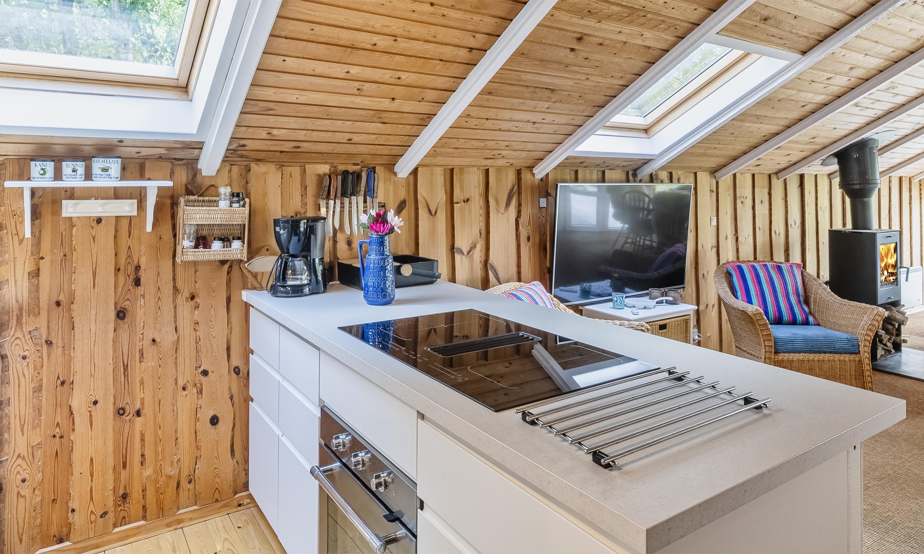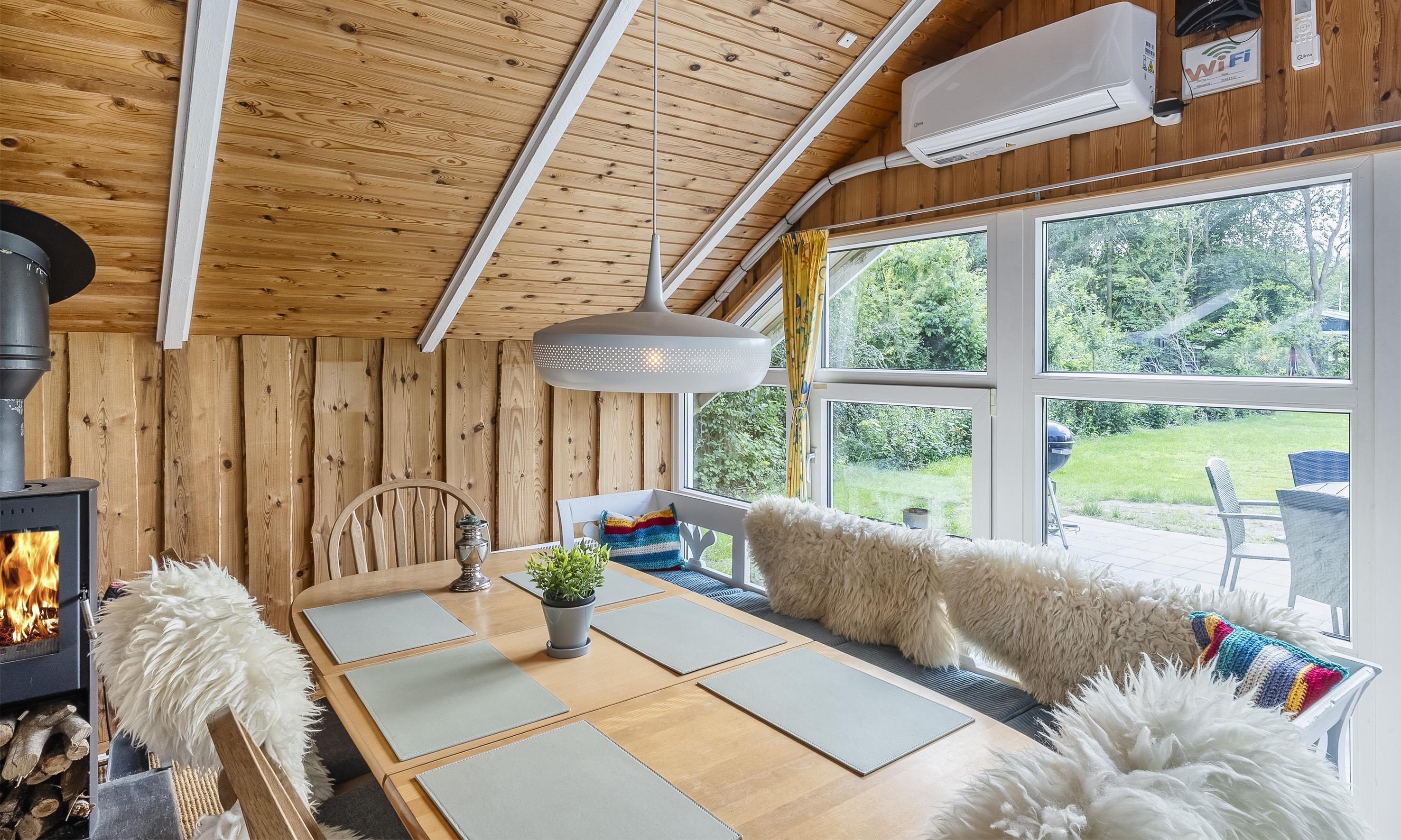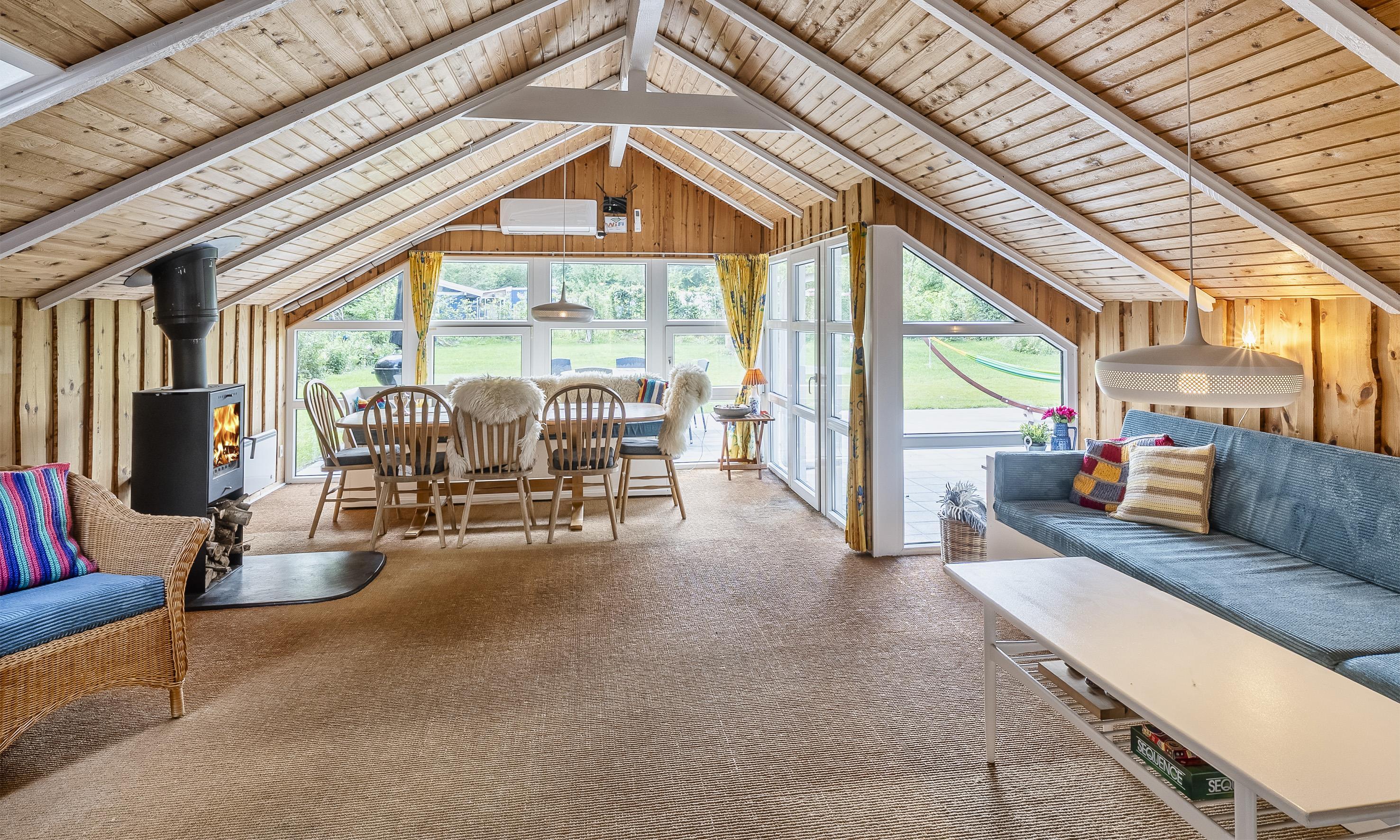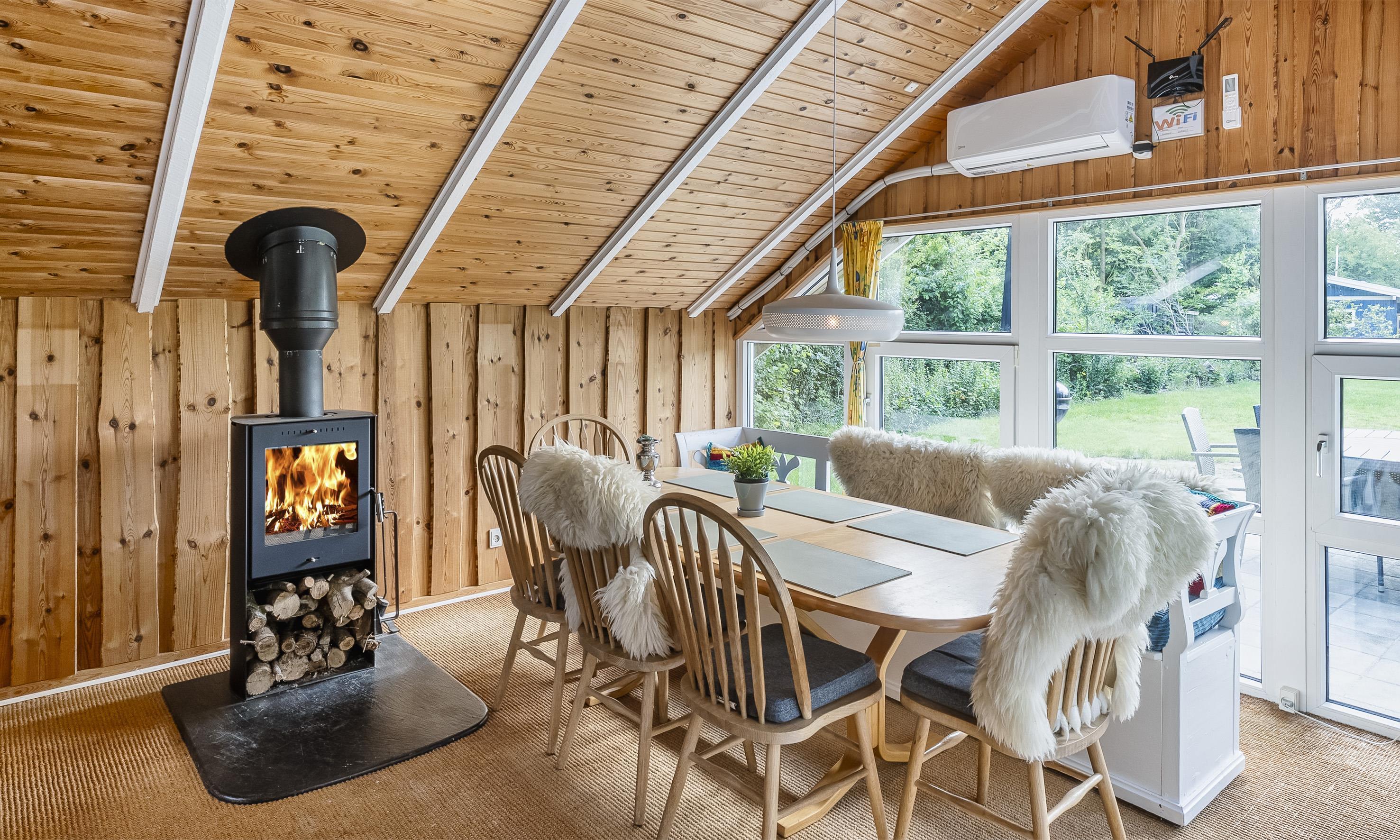 Das Ferienhaus ist mit einer offenen Küche eingerichtet, die mit dem Essbereich verbunden ist, sowie einem Wohnzimmer mit hoher Decke und Zugang zur großen Terrasse. Das Badezimmer verfügt über WC, Waschbecken und Dusche. Es gibt zwei Schlafzimmer mit insgesamt vier Schlafplätzen: eines mit Doppelbett und eines mit zwei Einzelbetten (DB + 2 EB). Im Wohnzimmer finden Sie außerdem einen Kaminofen und eine energieeffiziente Wärmepumpe, die für eine gemütliche und angenehme Wärme sorgt. Der große Garten lädt zu vielen Aktivitäten für die ganze Familie ein.