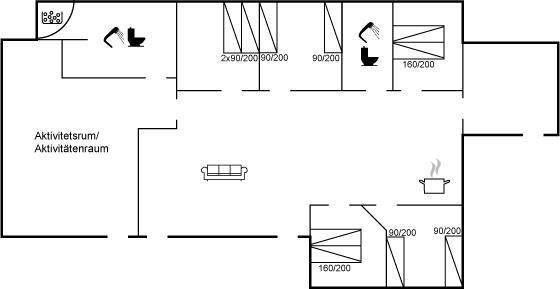 Die Schlafplätze verteilen sich auf 5 Schlafräume. 4 Schlafplätze in Doppelbetten. 6 Schlafplätze in Einzelbetten. Ferner steht ein Kinderbett zur Verfügung.