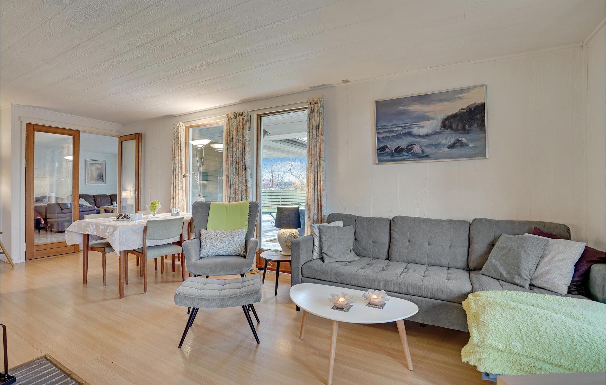 Das ansprechende Haus erwartet Sie in attraktiver Lage inmitten herrlicher Natur und in Sichtweite des Fjords. Machen Sie es sich hier mit Ihren Lieben gemütlich und gönnen Sie sich eine wohlverdiente Pause von der Alltagshektik. Helle Räume, bodentiefe Fenster, die Sie die schöne Aussicht optimal genießen lassen und charmante Details wie der gemauerte Kaminofen machen das Ferienhaus zu einer Oase für die perfekte Urlaubsentspannung. Lassen Sie beim gemeinsamen Essen den Blick über die pittoreske Natur der Umgebung schweifen und bringen Sie anschließend bei einem Familienduell den Kreislauf wieder in Schwung.