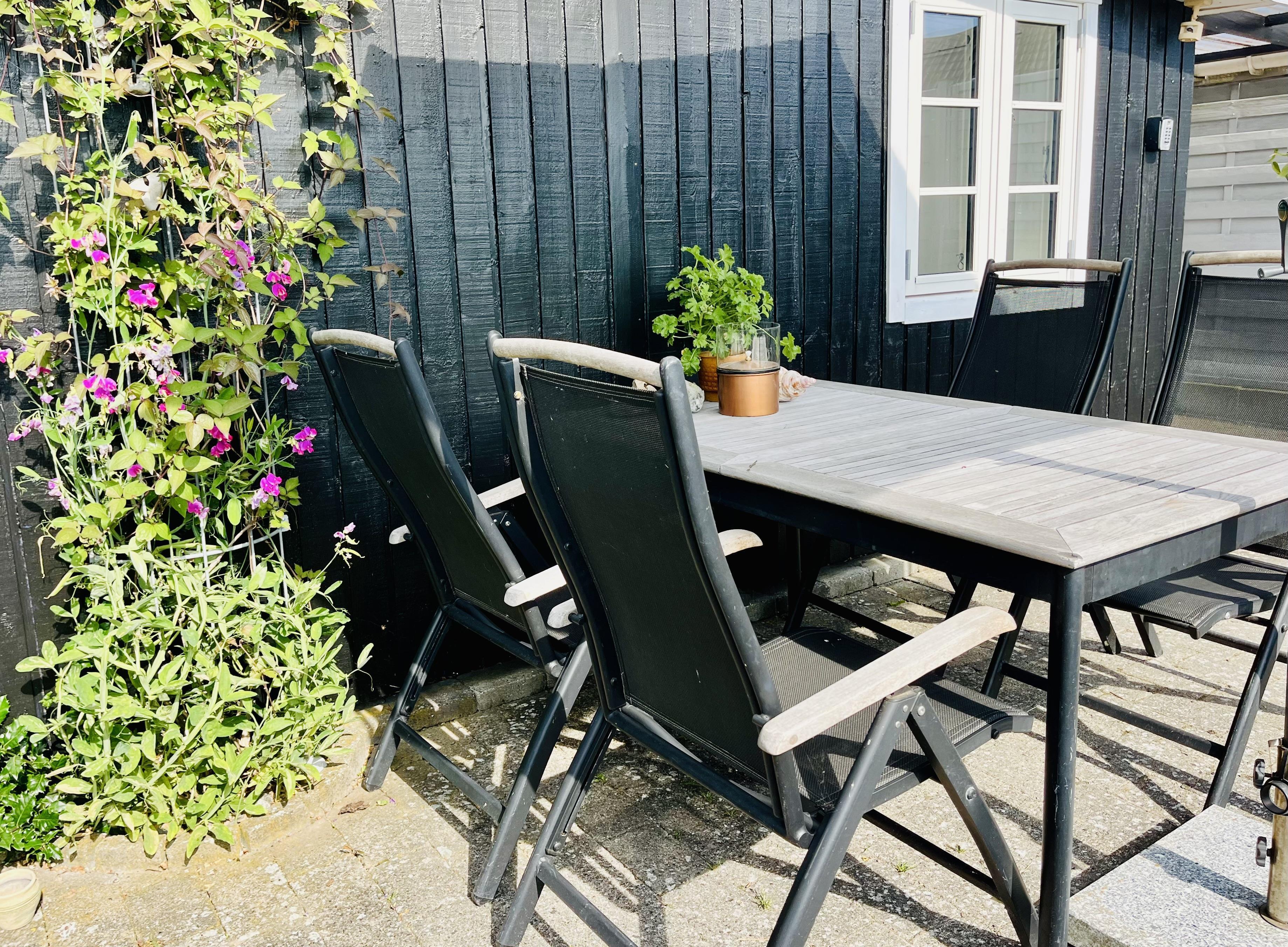 Draußen gibt es sowohl eine offene als auch eine überdachte Terrasse und einen kleinen Garten mit Gartenmöbeln und Grill. Das Grundstück ist eingezäunt.
