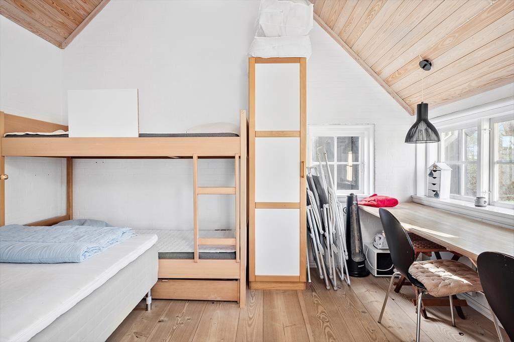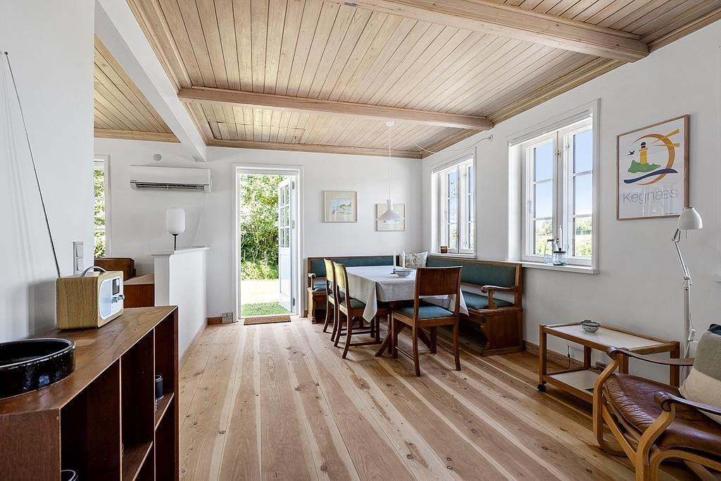 Dieses Ferienhaus begrüßt Sie mit einer guten Küche, die einen Essplatz und einen Zugang zum Garten umfasst. Die Küche ist offen mit dem Wohnraum verbunden, in dem eine energiesparende Wärmepumpe und ein Kaminofen für eine behagliche Atmosphäre sorgen. Das Badezimmer verfügt über eine Waschmaschine und eine Fußbodenheizung. Die Schlafplätze verteilen sich auf einen Schlafraum mit einem Doppelbett und einen Schlafraum mit einem Doppelbett und einem Etagenbett.