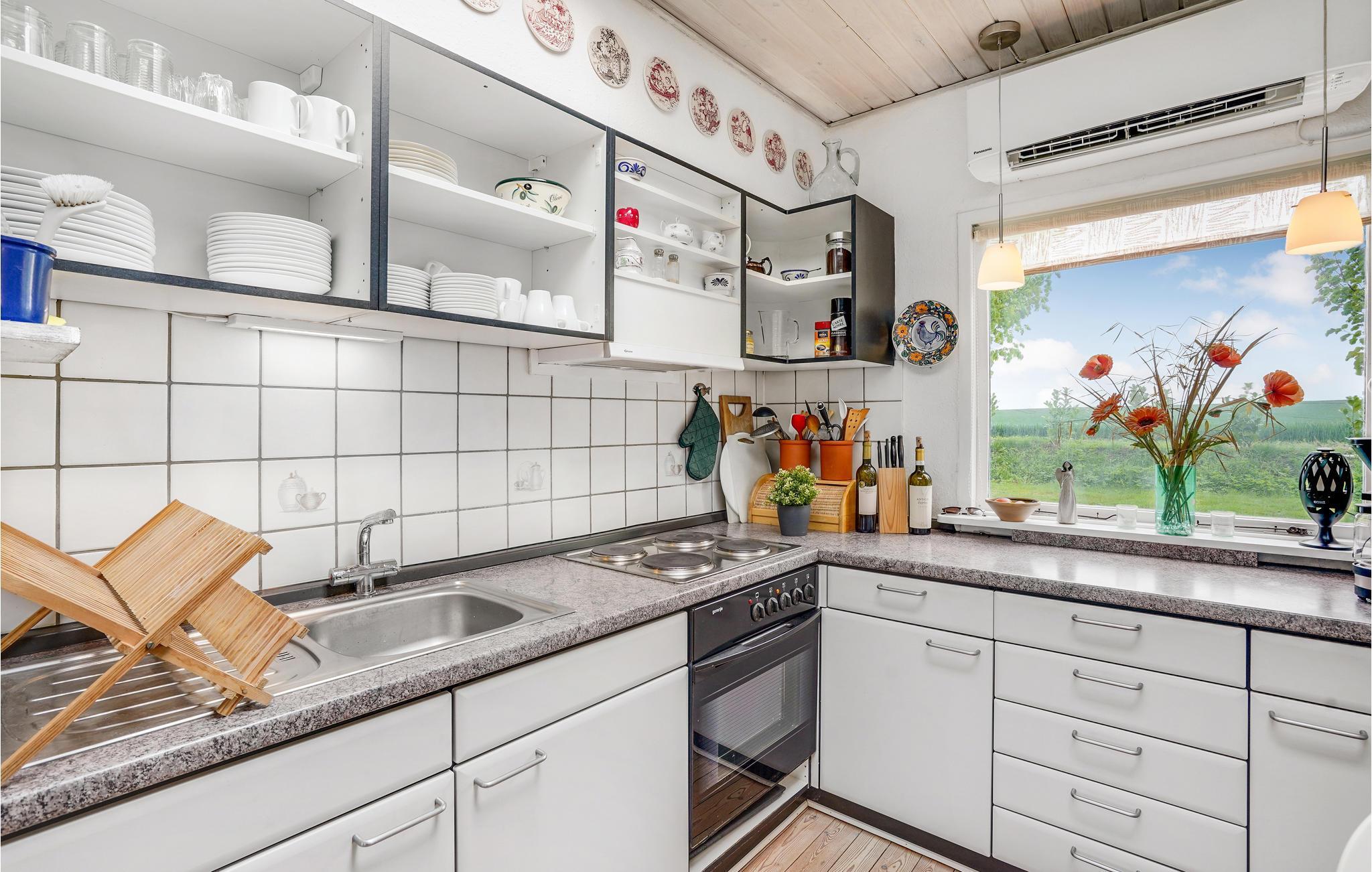 Nur circa 200 m vom Meer und dem Strand entfernt, erwartet Sie dieses schöne Ferienhaus bei Kegnæs Strand. Im Inneren des Hauses stehen Ihnen zwei Schlafzimmer, mehrere Wohnbereiche, eine offene Küche und ein Badezimmer zur Verfügung. Am Abend können Sie auf dem Sofa bei Kerzenschein ein Glas Wein genießen und den Urlaubstag ruhig ausklingen lassen. An kühlen Tagen verbreitet der Kamin in der Leseecke angenehme Wärme und Gemütlichkeit.