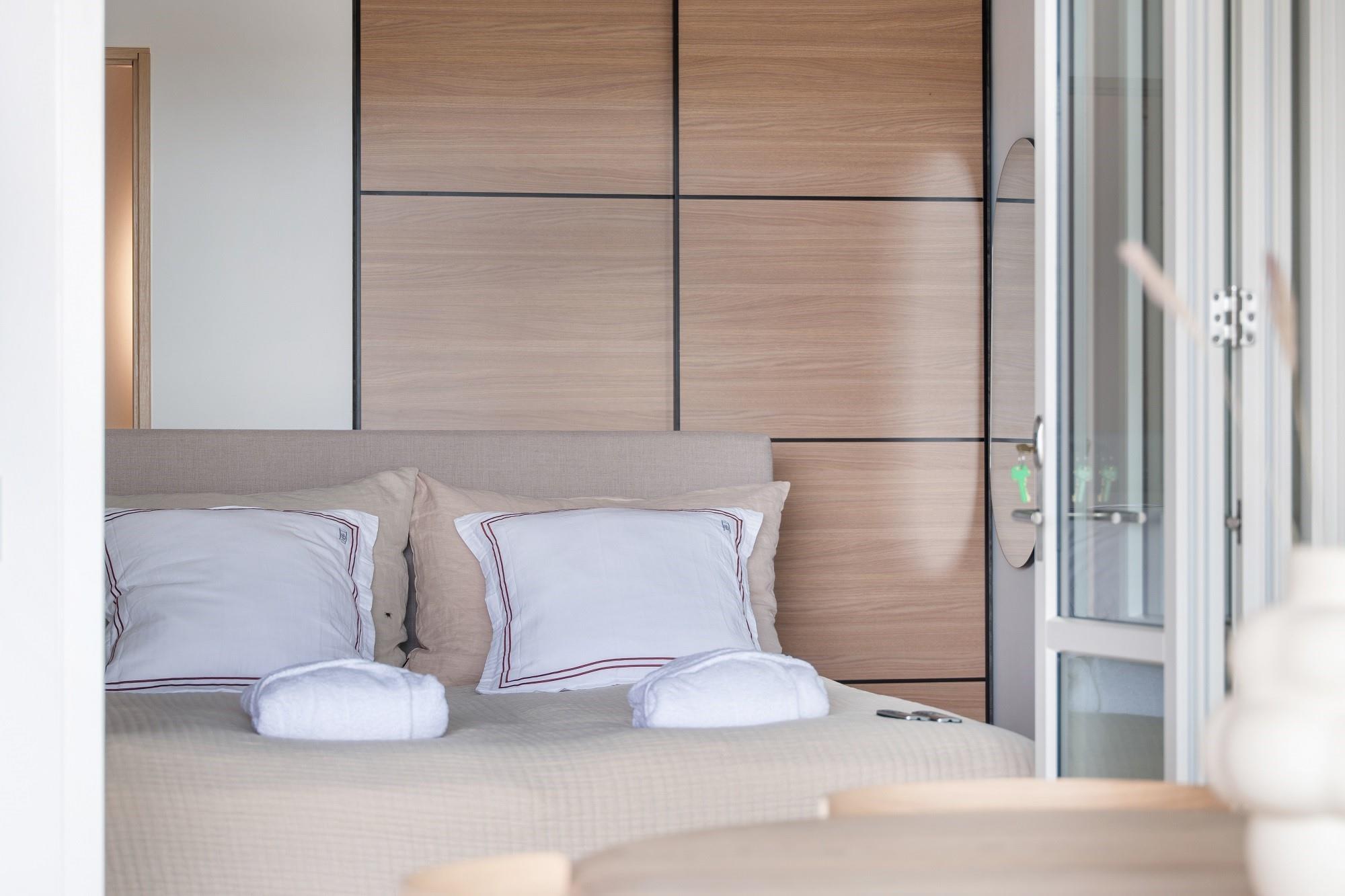 Die Wohnung liegt im Erdgeschoss und ist geschmackvoll mit schönen Details eingerichtet. Von Wohnzimmer und Küche aus kann die weitläufige Terrasse betreten werden. An einem warmen Sommertag können die großflächigen Faltschiebetüren geöffnet werden, so dass man der Natur und dem Strand noch näher ist. Die Wohnung verfügt über 3 Schlafräume, von denen zwei mit einem Doppelbett eingerichtet sind. In einem der Doppelzimmer kannst du im Bett liegend durch die großflächige Glaspartie zum Wohnzimmer hin den Sonnenaufgang genießen. Dieses Zimmer hat direkten Zugang zum eigenen Bad. Das zweite Badezimmer ist über den Flur erreichbar. Die Wohnung hat Smart-TV, wo du über den Handy oder Ipad streamen kannst (keine TV-Programme).