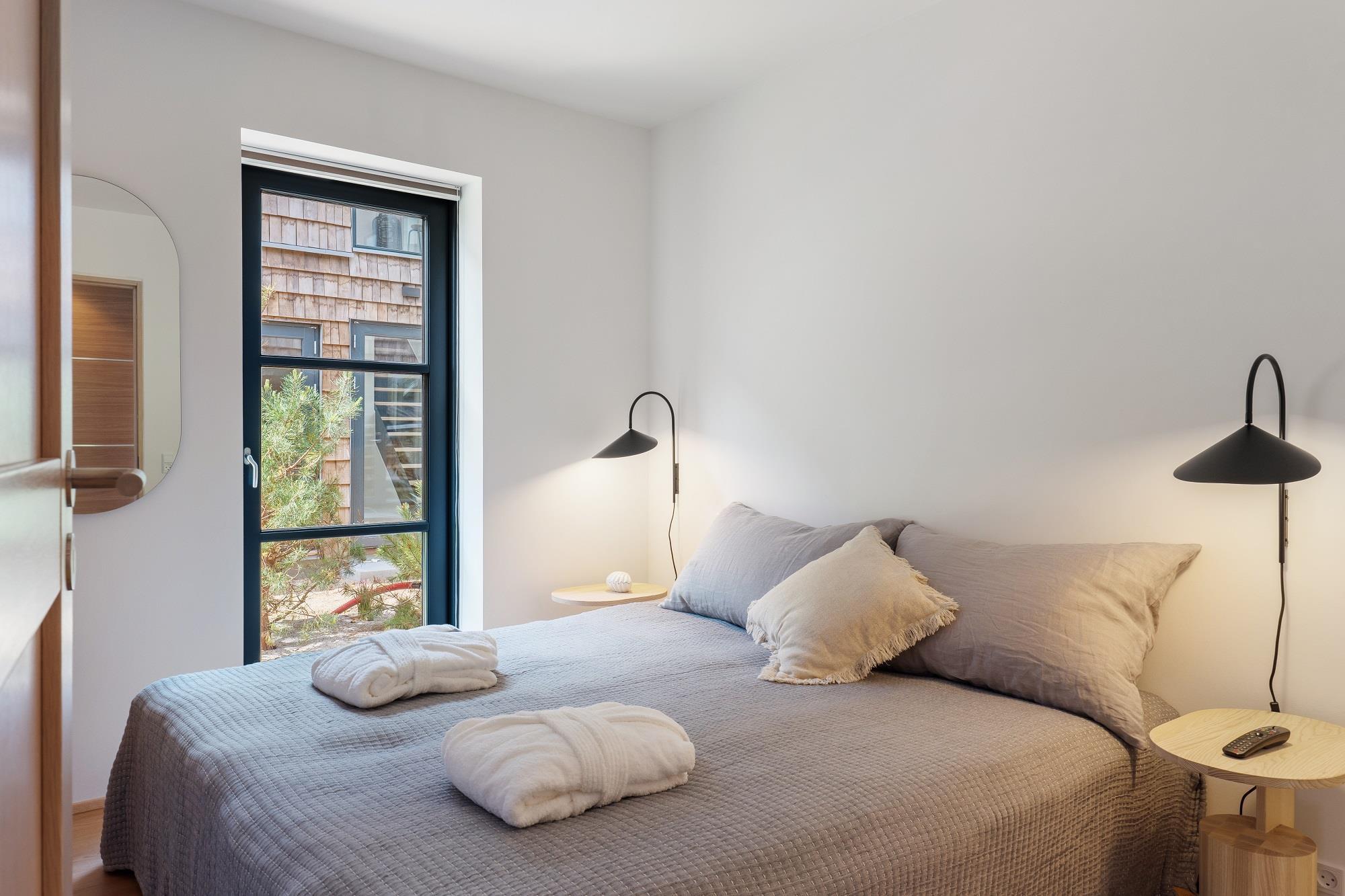 Die Wohnung liegt im Erdgeschoss und ist geschmackvoll mit schönen Details eingerichtet. Von Wohnzimmer und Küche aus kann die weitläufige Terrasse betreten werden. An einem warmen Sommertag können die großflächigen Faltschiebetüren geöffnet werden, so dass man der Natur und dem Strand noch näher ist. Die Wohnung verfügt über 1 Schlafraum mit Doppelbett und 1 Badezimmer. Die Wohnung hat Smart-TV, wo du mit den Handy oder Ipad streamen kannst (keine TV-Programme).