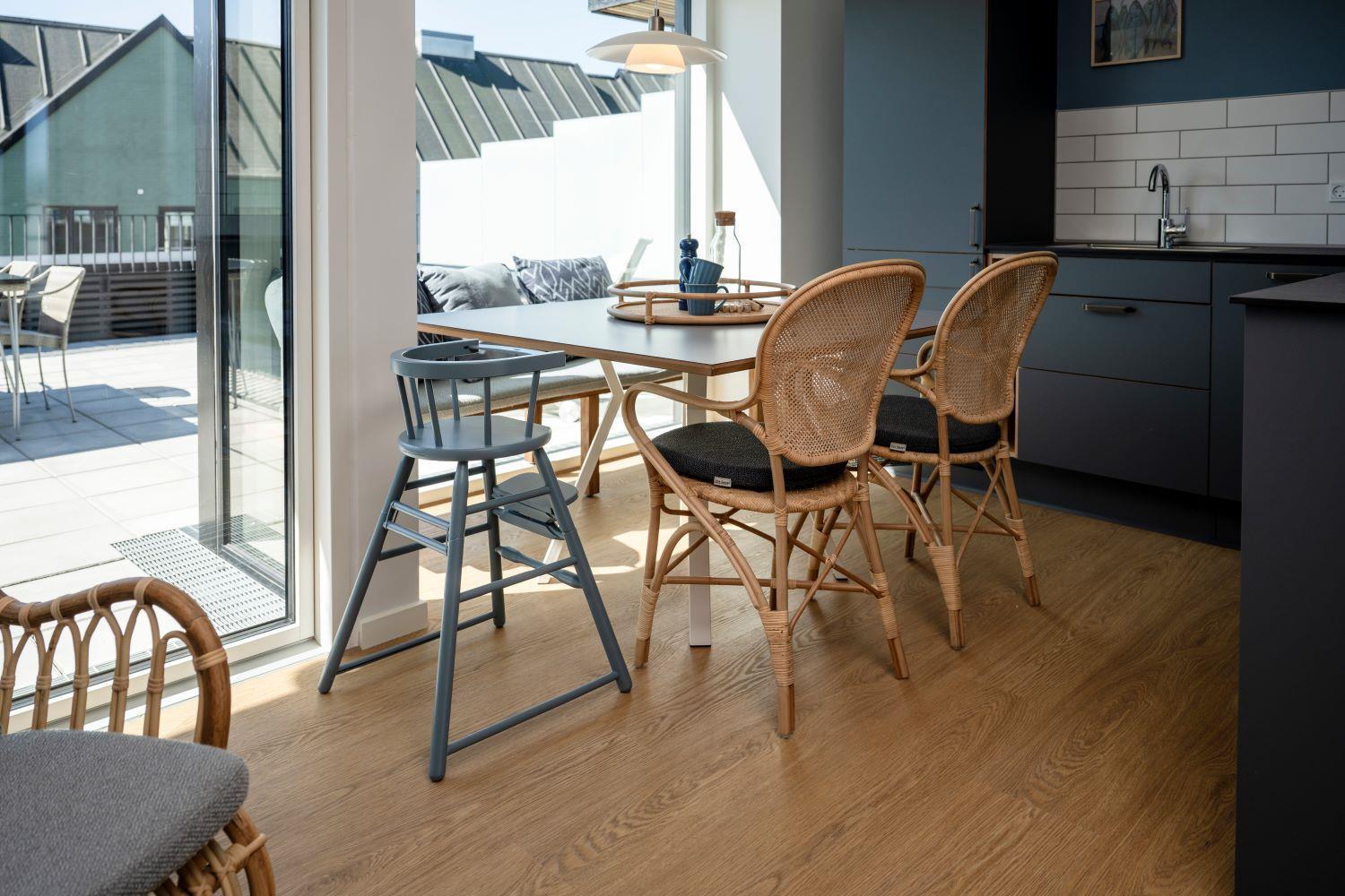 Vom Wohnzimmer aus hast du Zugang zu einer großen, privaten Terrasse, auf der bequeme Gartenmöbel zu Entspannung und gemütlichen Momenten einladen. Von der Terrasse gibt es einen kleinen Blick auf den Hafen.