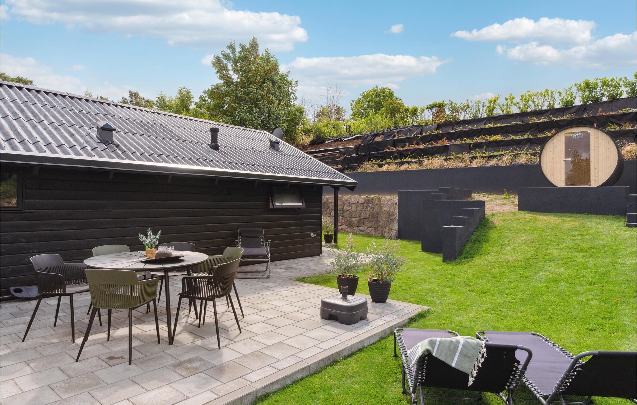 Stilvolles Ferienhaus mit Fasssauna im Freien, nur 150 m vom Wasser entfernt.